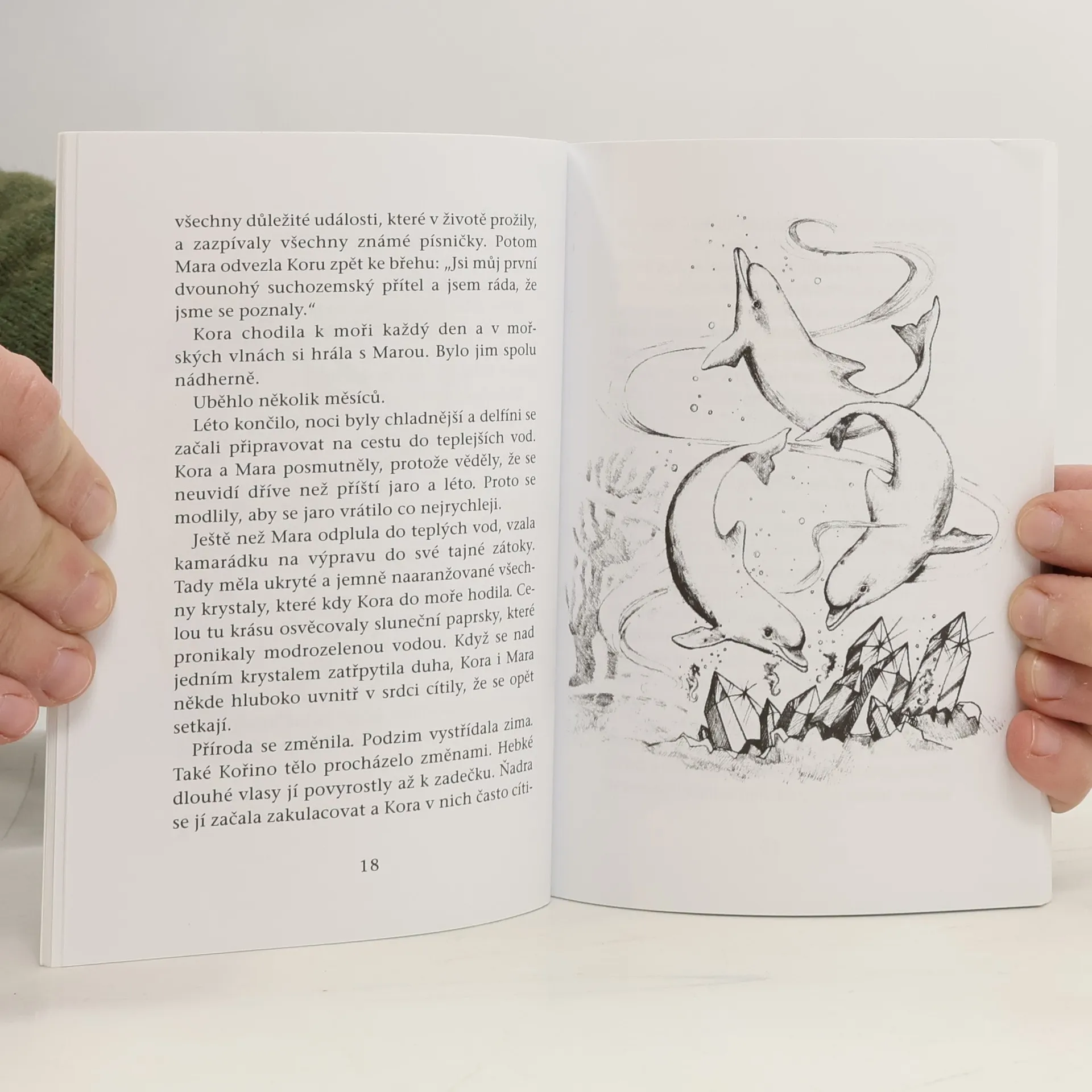 Dívka Kora, přátelící se s delfínem, prochází vnitřními biologickými změnami za účasti moudrých žen. V období prvních měsíčků přijímá duchovní poučení o posvátnosti ženství. Menarche, první menstruace, je pro dívky tajemnou bránou do nové etapy života, kdy se stávají ženami a matkami, prostorem pro růst nového života. Každá dívka by měla mít průvodce, kteří jí pomohou na této cestě – matku a starší ženy. Avšak mnohé ženy neměly možnost sdílet své zkušenosti, což v moderním světě vytváří pocity osamělosti a pochyb. Každý z nás si tak skládá mozaiku svého života, i když často chaoticky. Tato knížka může být jedním z dílků této mozaiky, zejména pro ženy. Kora prožívá velkou změnu ve svém životě, svou menarche, a vedle ní stojí její milující maminka Selena a čtyři staré moudré průvodkyně, které ji uvádějí do nového období. Kora symbolizuje každou dívku a ženu, čekající na zasvěcení do posvátných moudrostí a naplnění svých vnitřních touh. Rozkvétající ženo, blíží se tvá velká doba – doba měsíčků, čas požehnání, síly a tvořivosti. Oslavuj ji radostně a vděčně.