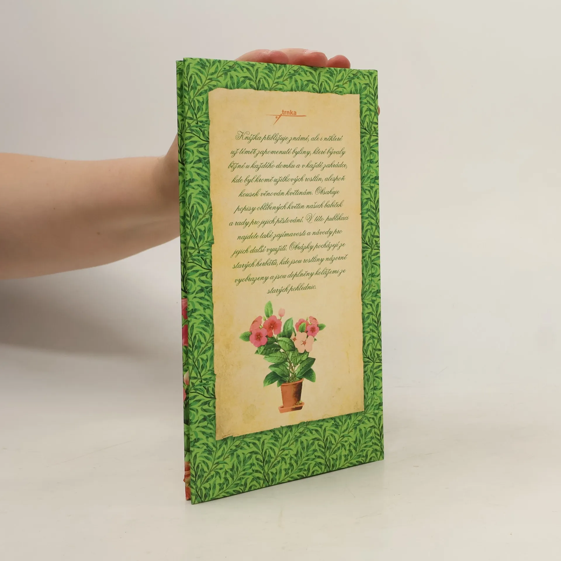 Knížka přibližuje známé, ale i některé už téměř zapomenuté byliny, které bývaly běžné u každého domku a v každé zahrádce, kde byl kromě užitkových rostlin, alespoň kousek věnován květinám. Obsahuje popisy oblíbených květin našich babiček a rady pro jejich pěstování. V publikaci najdete také zajímavosti a návody pro jejich další využití. Obrázky pocházejí ze starých herbářů, kde jsou rostliny názorně vyobrazeny a jsou doplněny kolážemi ze starých pohlednic.