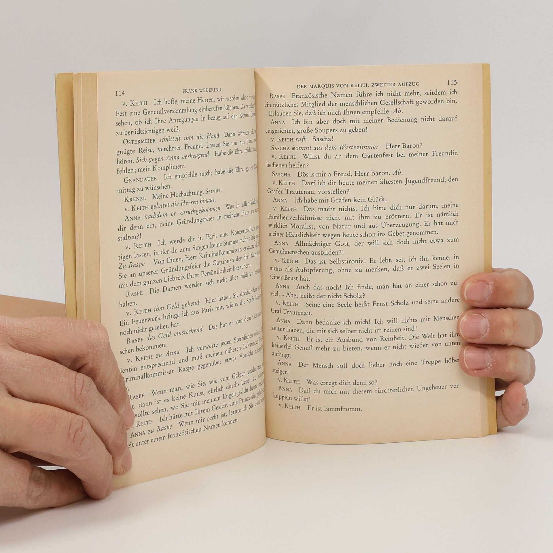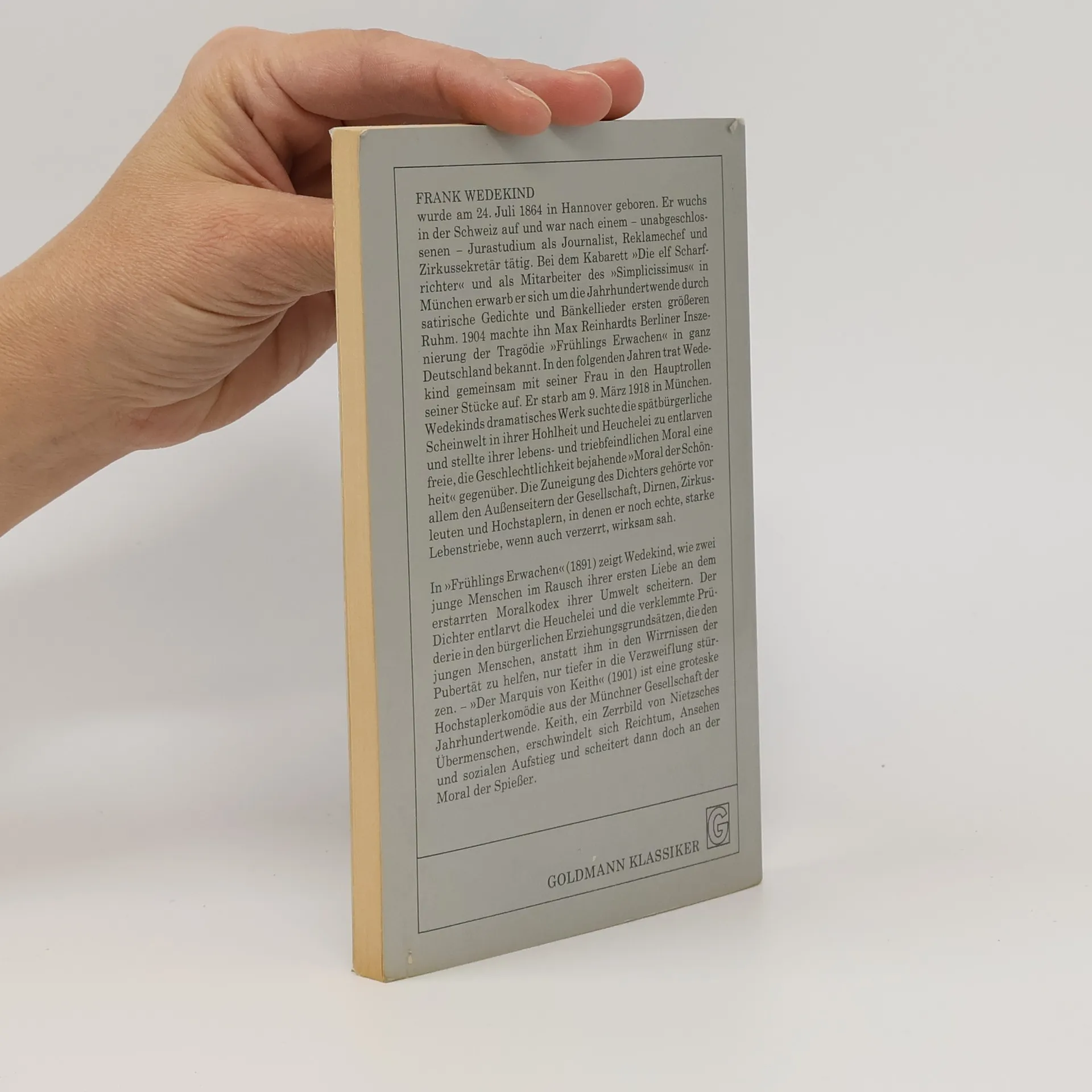 In Frühlings Erwachen (1891) zeigt Wedekind, wie zwei junge Menschen im Rausch ihrer ersten Liebe an dem erstarrten Moralkodex ihrer Umwelt scheitem. Der Dichter entlarvt die Heuchelei und die verklemmte Pıüderie in den bürgerlichen Erziehungsgrundsätzen, die den jungen Menschen, anstatt ihm in den Wirrnissen der Pubertät zu helfen, nur tiefer in die Verzweiflung stürzen.Der Marquis von Keith (1901) ist eine groteske Hochstaplerkomödie aus der Münchner Gesellschaft der Jahrhundertwende. Keith, ein Zerrbild von Nietzsches Übermenschen, erschwindelt sich Reichtum, Ansehen und sozialen Aufstieg und scheitert dann doch an der Moral der Spießer.