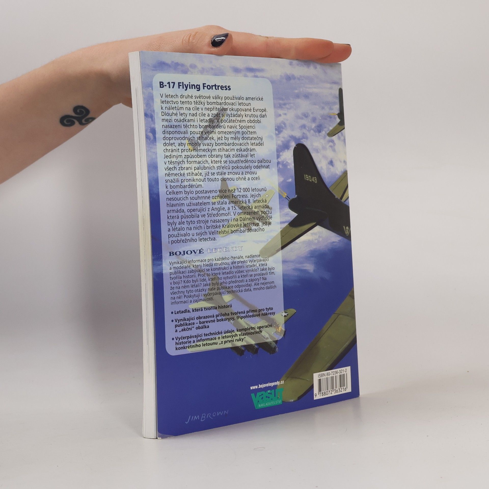 Kvalitní monografie přibližuje vývoj, takticko-technická data i různé verze a varianty bombardéru Spojených států z období 2. světové války. Čtyřmotorová létající pevnost B-17 (Flying Fortress) patřila k hlavním oporám americké 8. letecké armády při bojích v Evropě. Přestože měl tento střední výškový bombardér dlouhého doletu ve výzbroji 12-13 kulometů, střelecká ochrana proti nepřátelským stíhačům byla stále nedostatečná. Jen díky značně robusní konstrukci dokázal vydržet nesmírné množství zásahů. Až od poloviny r. 1944 zajišťovaly B-17 ochranu stíhačky s dostatečným doletem. Některé verze B-17 se využívaly k boji proti ponorkám i jako průzkumná či transportní letadla. Výklad je doplněn podrobnými technickými údaji, ukázkami různých kamufláží i zajímavými osudy některých posádek. Čb fotografie, bokorysy, seznam literatury, rejstřík, dodatky.