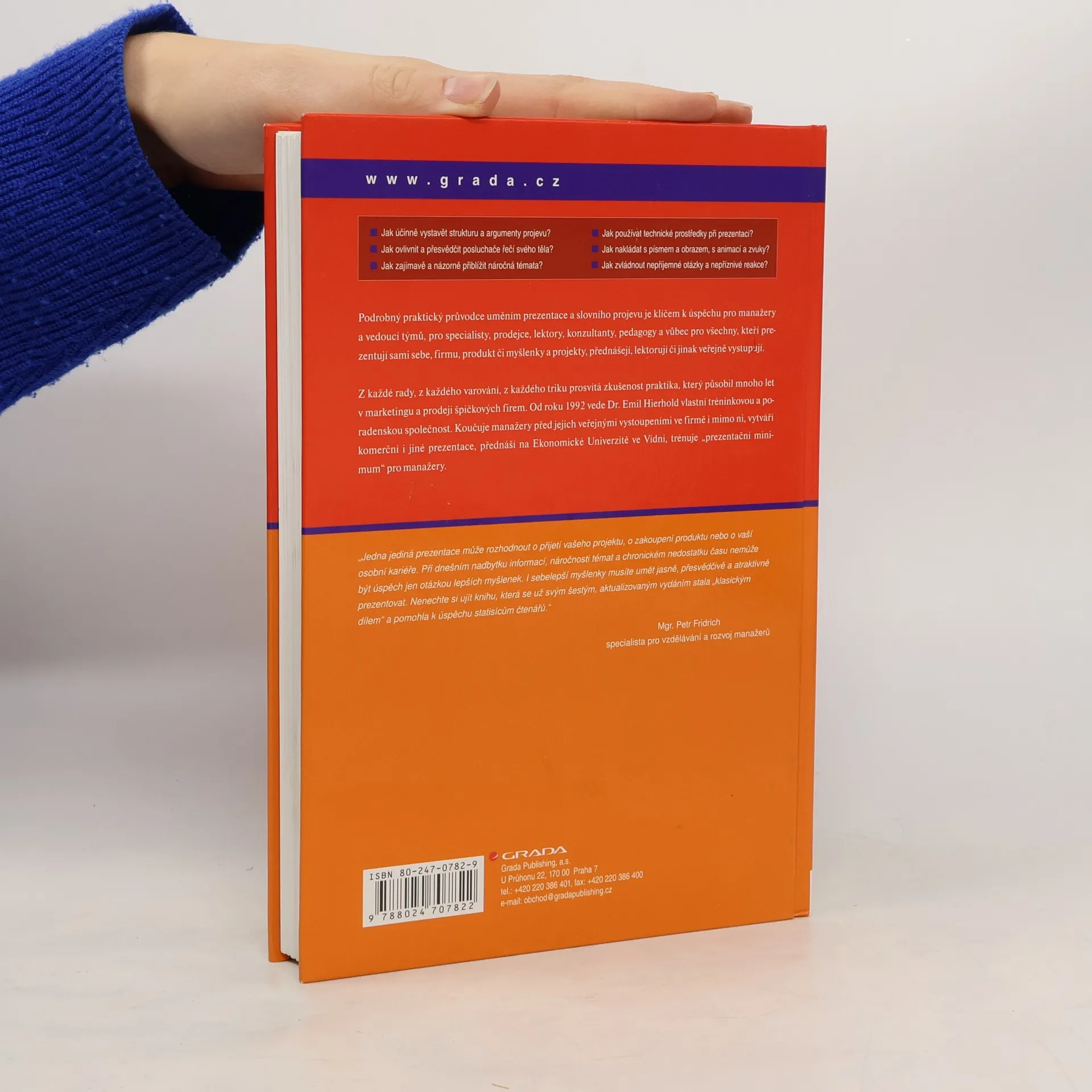 Sedmé, aktualizované vydání velmi úspěšné publikace o prezentaci a slovním projevu je určeno manažerům a vedoucím projektů, specialistům, prodejcům, lektorům, konzultantům a všem, kteří prezentují sami sebe, firmu, produkt či myšlenky, kteří přednášejí, lektorují či jinak veřejně vystupují. Kniha je výjimečná tím, že nabízí velké množství konkrétních ukázek, jak pracovat se slovy, písmem a obrazem. Poskytuje mnoho praktických rad, návodů a tipů, jak účinně vystavět strukturu a argumenty projevu, jak ovlivnit a přesvědčit posluchače řečí svého těla, jak zajímavě a názorně přiblížit náročná témata, jak používat technické prostředky při prezentaci, jak zvládnout nepříjemné otázky a nepříznivé reakce od publika a mnoho dalšího.