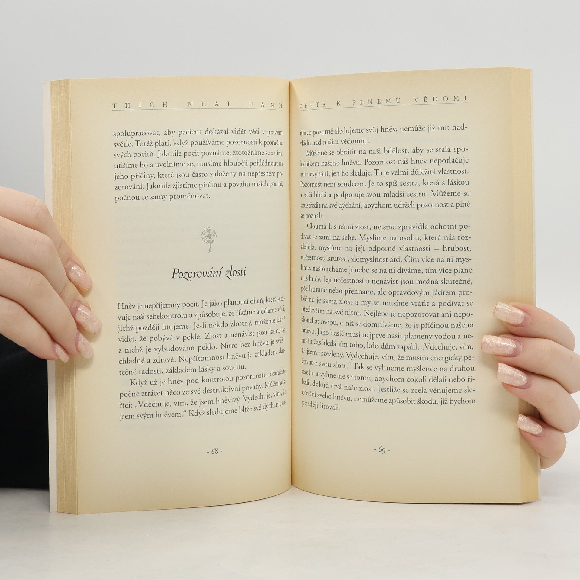 Tohle je velmi cenná kniha. Může změnit život jednotlivce i celé společnosti.“ – z předmluvy Jeho Svatosti Dalajlamy. Ve shonu moderního života máme sklon ztrácet spojení s mírem a pohodou, které jsou nám dostupné každým okamžikem. Světově proslulý zenový mistr, duchovní vůdce a spisovatel Thich Nhat Hanh nám ukazuje, jak pozitivně využít všech situací, které v nás obvykle vyvolávají tíseň a budí antipatie. Začíná tam, kde to čtenář zná – v kuchyni, za volantem auta, v kanceláři, při procházce parkem – a ukazuje, jak dosažitelná je hluboká meditativní přítomnost. Praktikuje cvičení, která mají zaměřit naši pozornost k našemu tělu i duši cestou vědomého dýchání, jež s okamžitou účinností přináší radost a mír a také ukazuje, jak si uvědomovat vztahy s ostatními lidmi a se světem, který nás obklopuje, s jeho krásou, ale i znečištěním a nespravedlností.