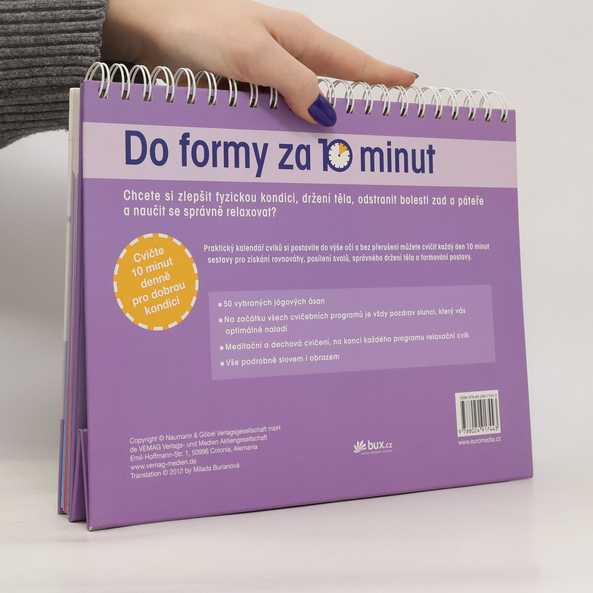 Praktický kalendář cviků pro dobrou kondici a zdraví. Chcete si zlepšit fyzickou kondici, držení těla, odstranit bolesti zad a páteře a naučit se správně relaxovat? Cvičte 10 minut denně pro dobrou kondici. Kalendář cviků si postavíte do výše očí a bez přerušení můžete cvičit každý den 10 minut 50 vybraných jógových ásan. Na začátku všech cvičebních programů je vždy pozdrav slunci, který vás optimálně naladí, meditační, dechová cvičení a relaxace doplní sestavy.