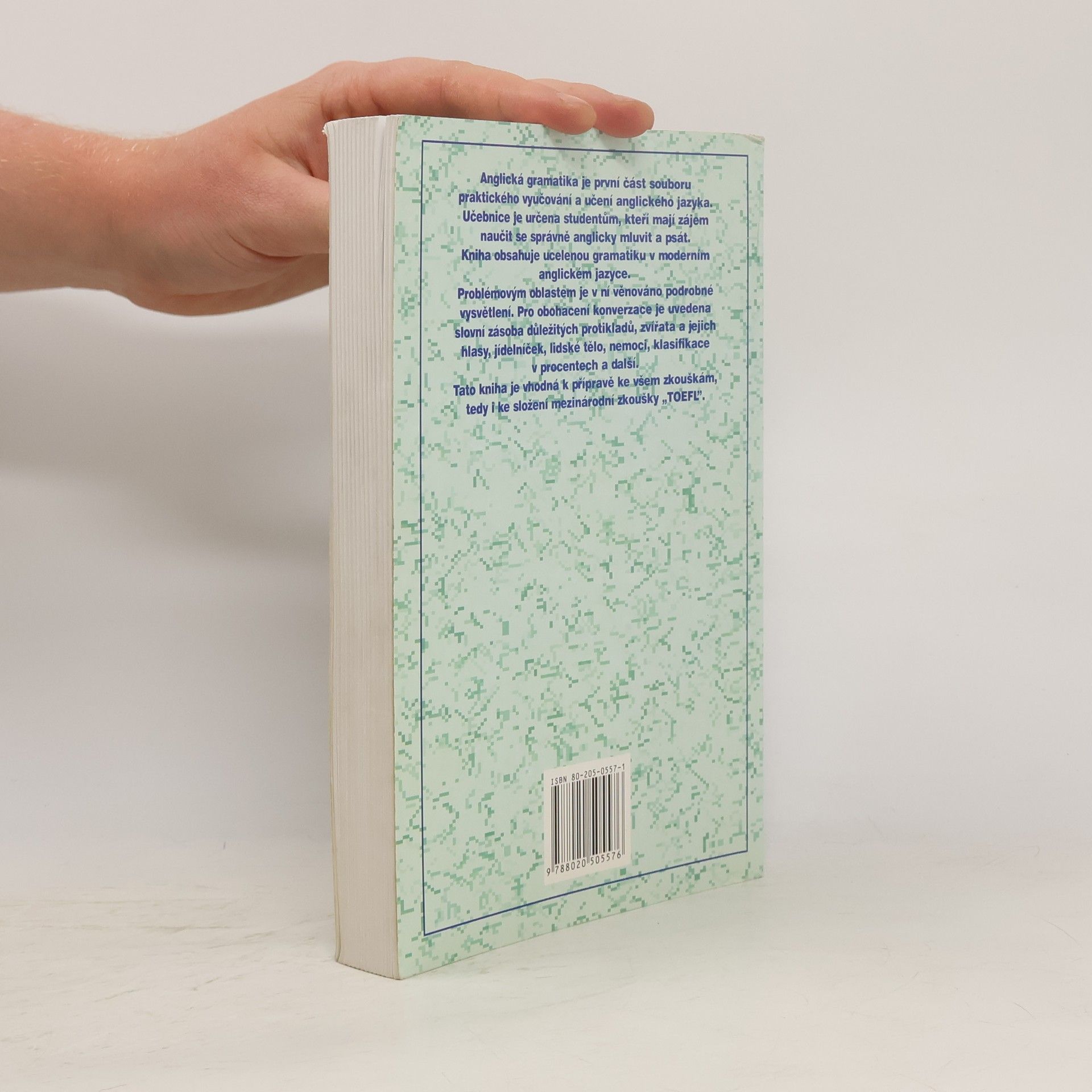 Anglická gramatika je první část souboru praktického vyučování a učení anglického jazyka. Učebnice je určena studentům, kteří mají zájem naučit se správně anglicky mluvit a psát. Kniha obsahuje ucelenou gramatiku v moderním anglickém jazyce. Problémovým oblastem je v ní věnováno podrobné vysvětlení. Pro obohacení konverzace je uvedena slovní zásoba důležitých protikladů, zvířata a jejich hlasy, jídelníček, lidské tělo, nemocí, klasifikace v procentech a další.Tato kniha je vhodná k přípravě ke všem zkouškám, tedy i ke složení mezinárodní zkoušky "TOEFL".