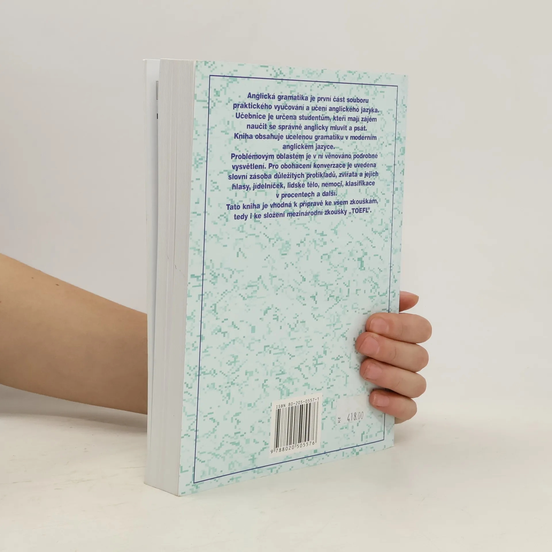 Anglická gramatika je první část souboru praktického vyučování a učení anglického jazyka. Učebnice je určena studentům, kteří mají zájem naučit se správně anglicky mluvit a psát. Kniha obsahuje ucelenou gramatiku v moderním anglickém jazyce. Problémovým oblastem je v ní věnováno podrobné vysvětlení. Pro obohacení konverzace je uvedena slovní zásoba důležitých protikladů, zvířata a jejich hlasy, jídelníček, lidské tělo, nemocí, klasifikace v procentech a další.Tato kniha je vhodná k přípravě ke všem zkouškám, tedy i ke složení mezinárodní zkoušky "TOEFL".