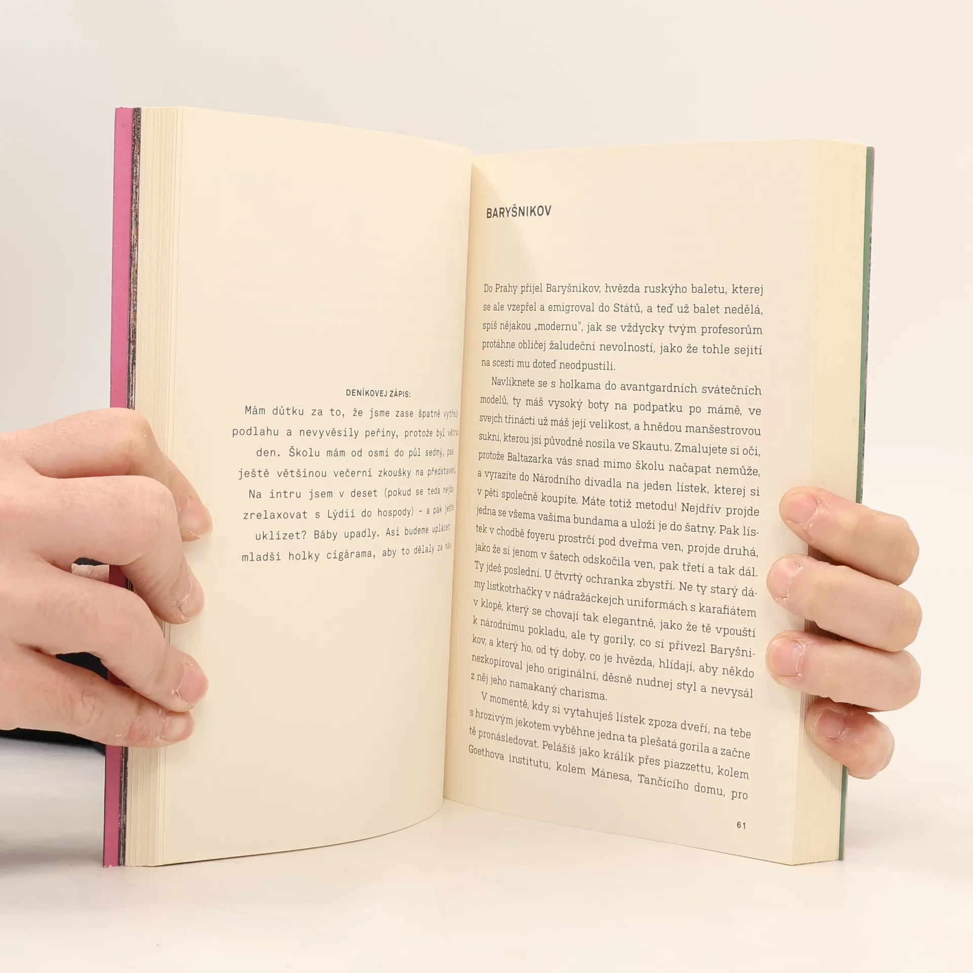 Baletky mají dvě tváře. Tu přední, usměvavou a dokonalou, kterou vidí publikum. A pak tu odvrácenou, když zmizí za oponou, předpisový úsměv jim spadne a tvář se zkřiví do ztrhaného šklebu, protože se dusí. Při tanci totiž nemůžou dýchat pusou. Třeští oči a lapají po dechu. Kdyby baletky někdo takhle nafilmoval, byla by to přehlídka utrpení. K tomu jsou ale trénované. Tak jako hlavní hrdinka tohohle příběhu. Každý den zažívá baletní dril jako v armádě. Ještě jí nebylo čtrnáct, a už je odbornicí na používání projímadel a zvracení, aby si udržela váhu, na ošetřování krvavých palců a stahování prsou. A do toho poznává klubový život v Praze. Jsou devadesátá léta, frčí perník a extáze a ona objevuje sex a zjišťuje, že má nevlastního bratra, který je úplně jiný, než by chtěla. A že její sen stát se baletkou a tančit ve Zlaté kapličce se mění v noční můru. Režisérka a tanečnice Miřenka Čechová vychází z vlastních zkušeností a deníkových zápisků. Její próza je sebeironickým, syrovým a nelítostným obrazem studií na Taneční konzervatoři a pražského života v divokých 90. letech.