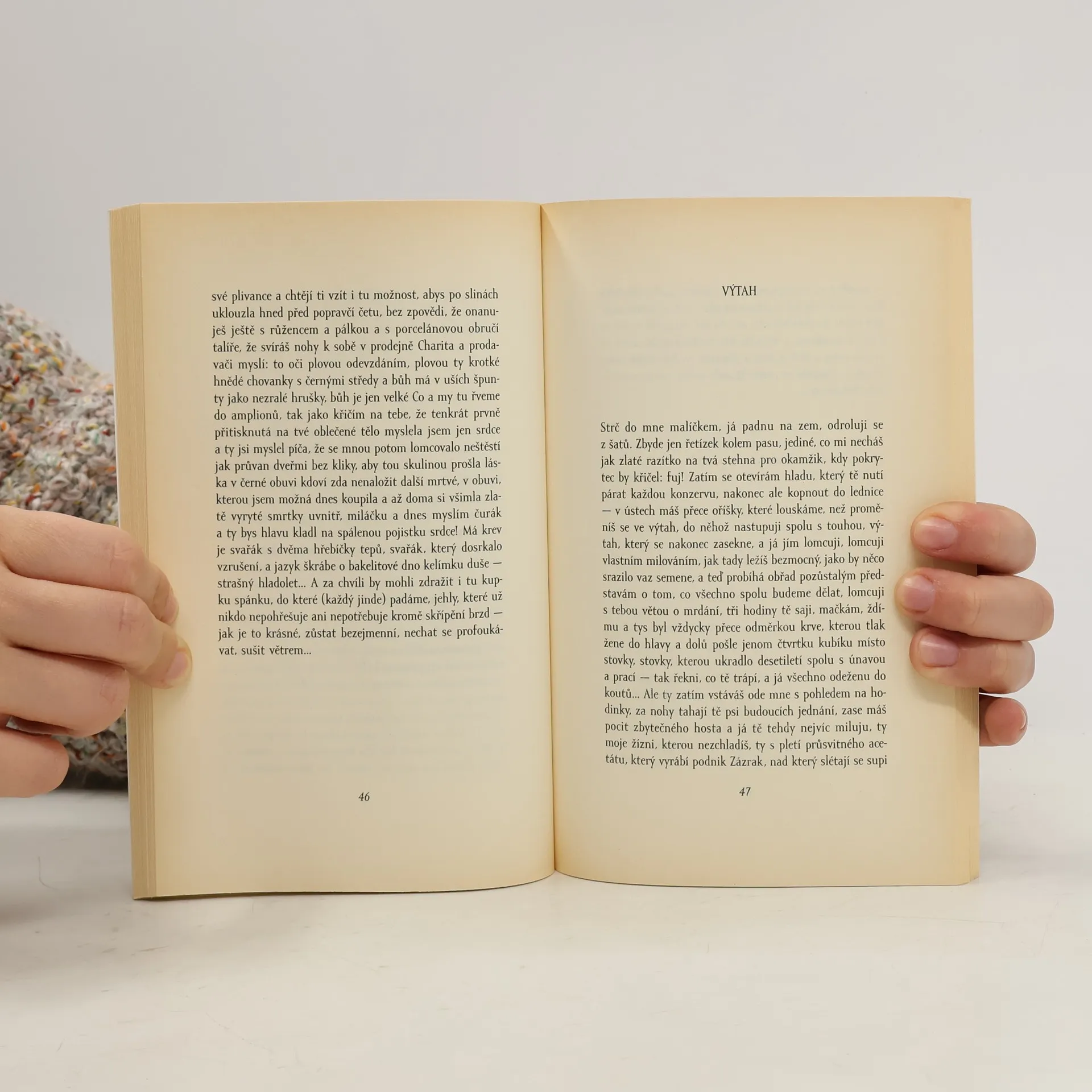 Originální pojetí erotické básně v próze. Autorka zde staví do kontrastu milostnou poetiku a lyriku s místy až cynickým či brutálním pohledem na intimní sféru. Použitý jazyk vypovídá o autorčině bohatství v tomto směru; stojí tu vedle sebe básnické obraty i expresivní slova.