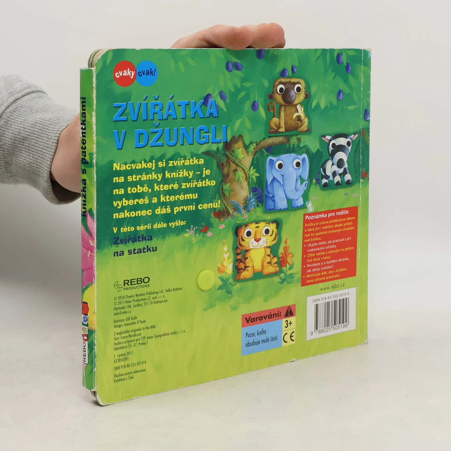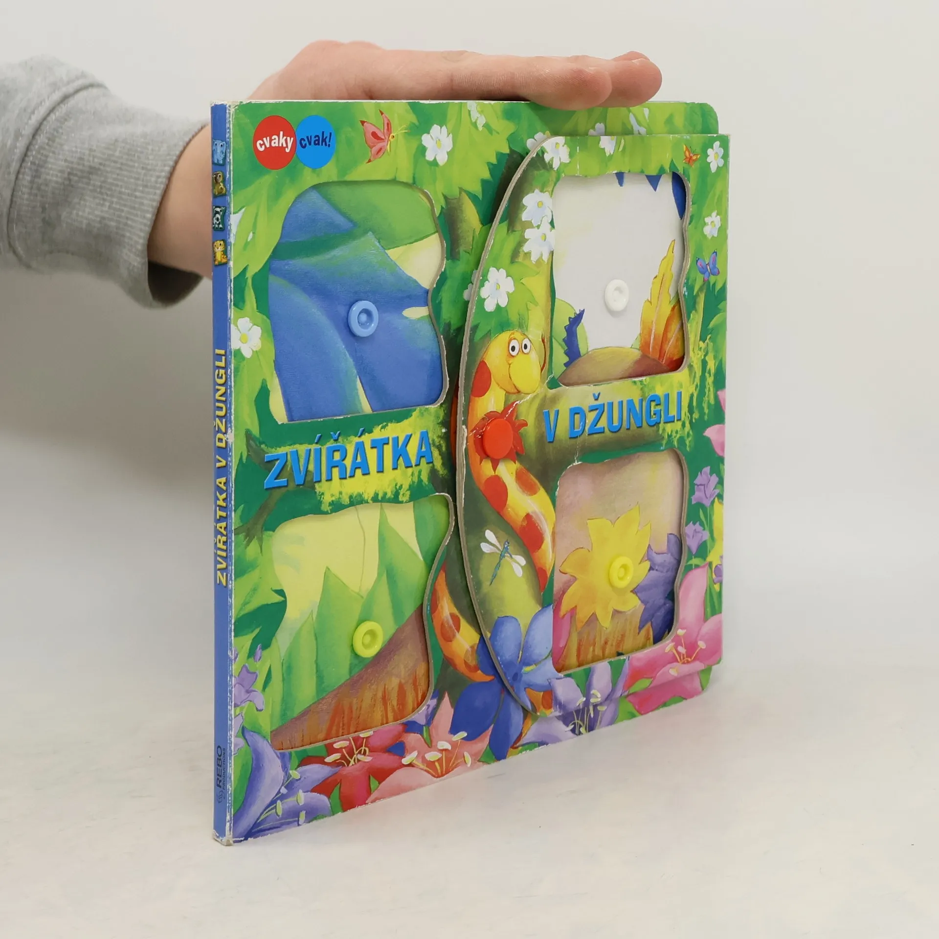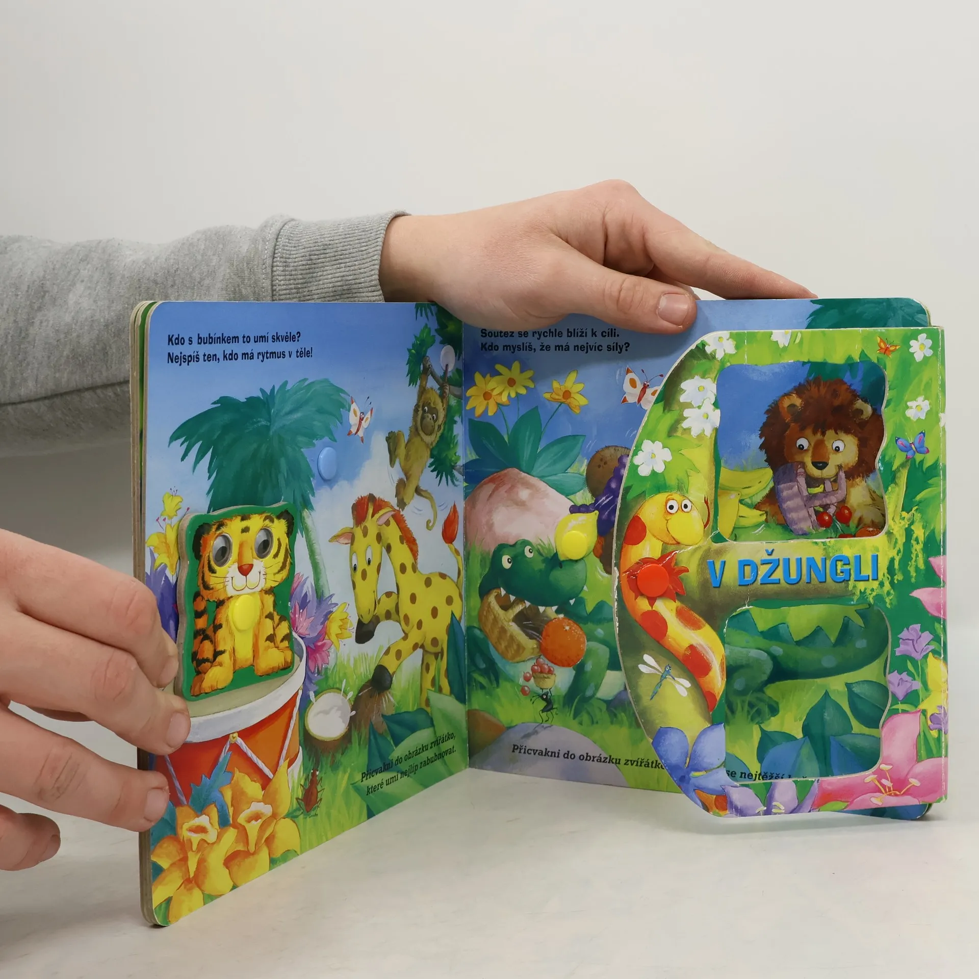 Knížka Zvířátka v džungli je plná barevných ilustrací a vypráví veršovaný příběh o tom, jak se zvířecí hrdinové přihlásili do soutěže Hledáme nové talenty. Pomocí čtyř zvířátek, které jsou opatřeny patentkami a je možné je upevnit na kteroukoliv stránku knížky, lze příběh dotvářet a různě variovat. Děti se tak mohou samy podílet na průběhu soutěže a zvolit vítěze. S odepínatelnými postavičkami si lze hrát i samosta
