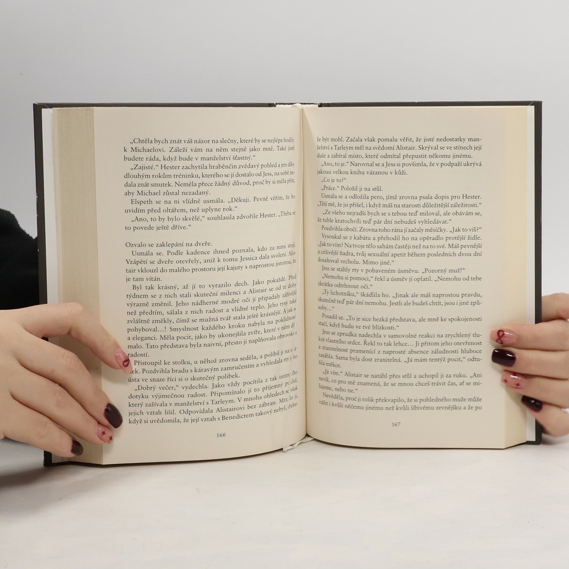 Před sedmi lety, v předvečer své vlastní svatby, se ctnostná a spořádaná lady Jessica Sheffieldová stala svědkem hříšné podívané, jakou si taková nevinná mladá dáma nikdy nedokázala představit. Tento výjev ji šokoval a podivně vzrušil zároveň. Tajemství o zhýralém Alistairu Caulfieldovi si nechala pro sebe a provdala se, jak od ní všichni očekávali. Avšak i po dlouhých letech poklidného a šťastného manželství ji Caulfieldův obrázek neopouštěl a vyvolával v ní nemravné představy… …o to sladší pak byla odměna. Alistair utekl od představy nádherné lady Jessiky s vášnivým pohledem v očích až do Západní Indie. Coby úspěšný obchodník měl už jen málo společného s chlípníkem, jakého kdysi znala. Když se čerstvě ovdovělá Jessica nalodila na palubu jeho impozantního korábu na cestu přes oceán, zůstane jediným strážcem sedm let potlačovaných tužeb jen pár vrstev jemného hedvábí. Brzy oba poznají, že den, kdy pokušení podlehnou, se nezadržitelně blíží…