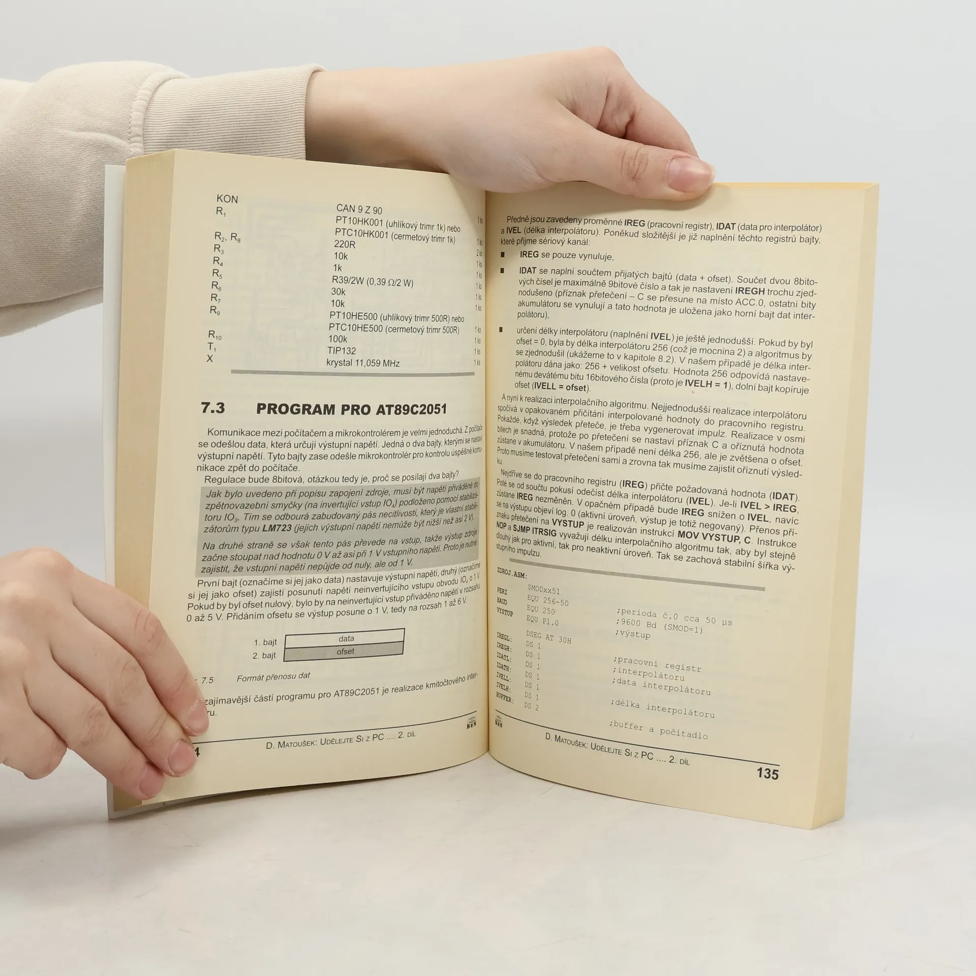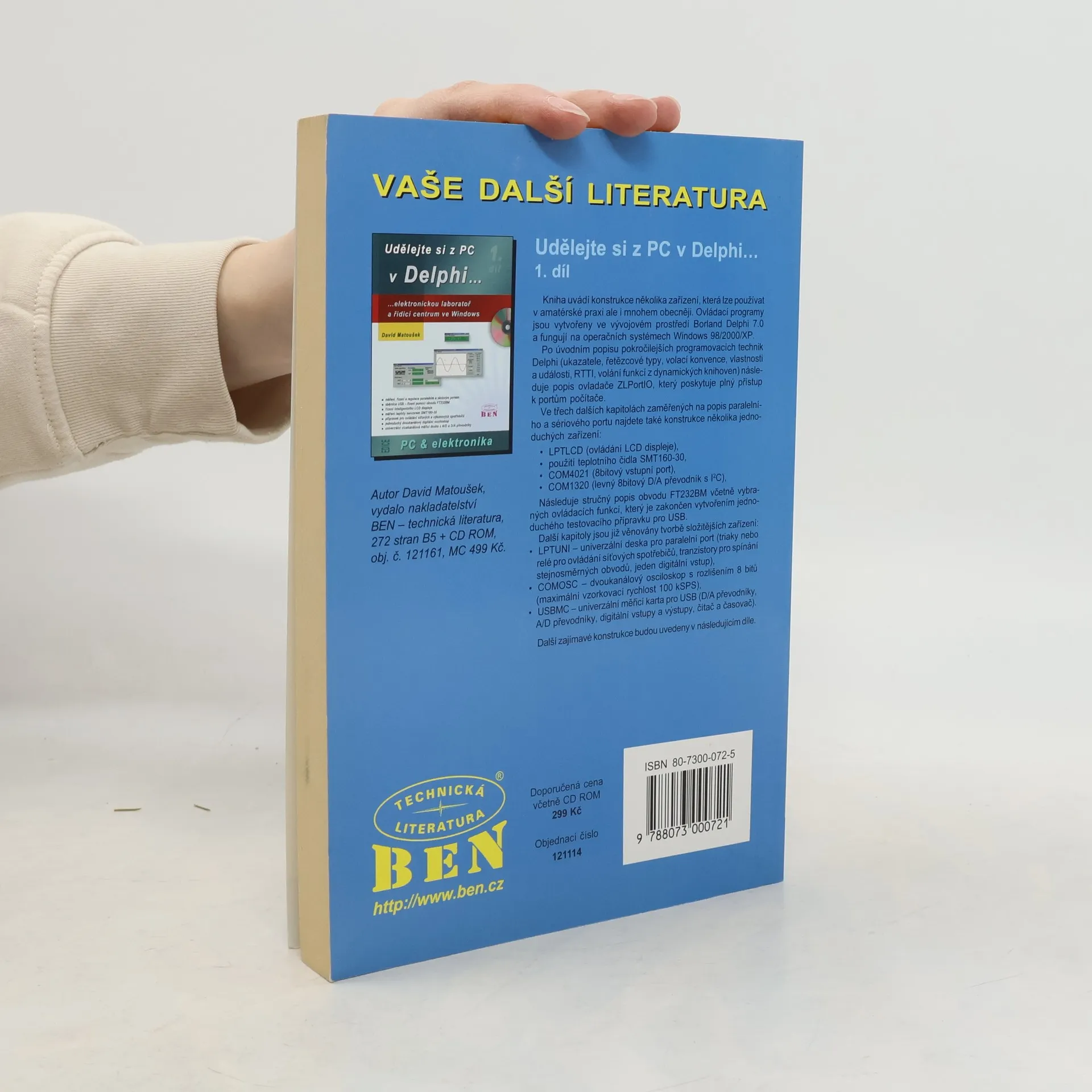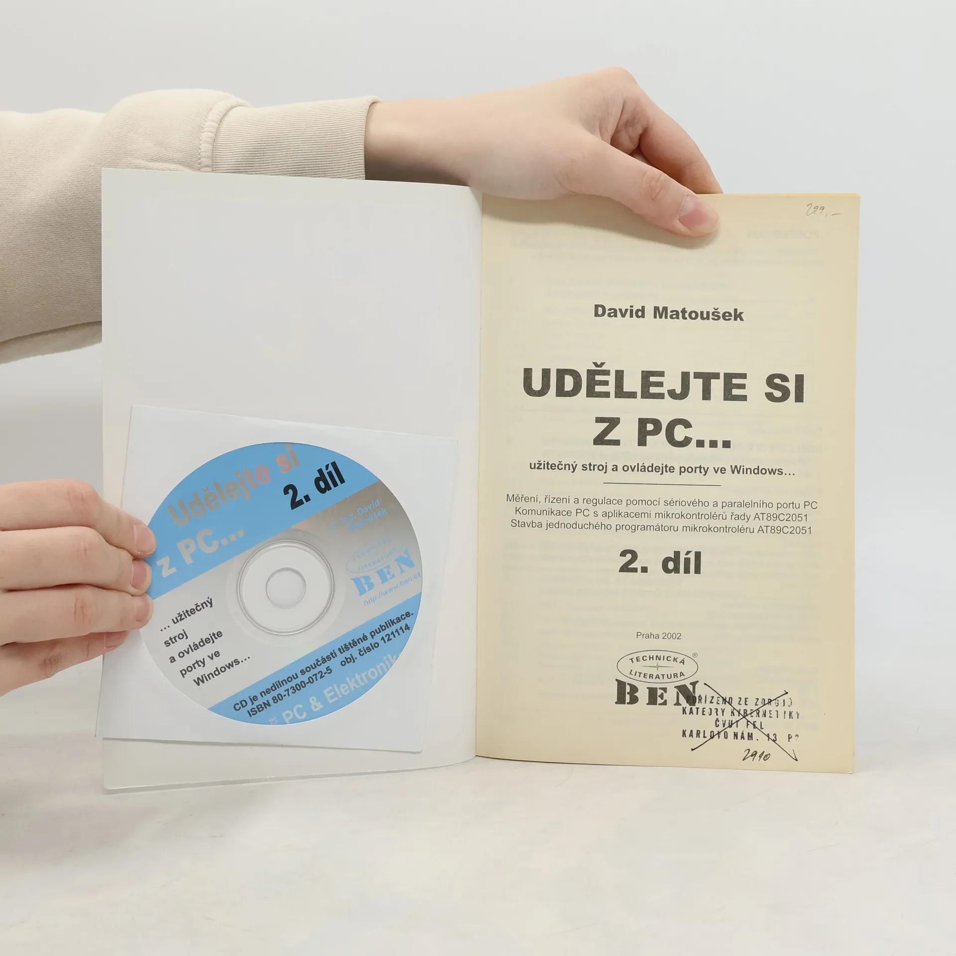 Kniha je určena čtenářům se znalostmi číslicové techniky a programování mikrořadičů 8051. Popisuje elektronické přístroje řízené sériovým nebo paralelním portem počítače a ovládané programy běžícími na operačních systémech Windows 95, 98, NT, 2000 a Me, přičemž ovládací programy jsou vytvořeny ve vývojovém prostředí C++ Builder 5.0. První kapitola se zaměřuje na ovládání portů v systému Windows, včetně přímého přístupu na porty. Druhá kapitola popisuje mikrořadič AT89C2051 a jeho sériový kanál, který je využíván v dalších konstrukcích. Třetí kapitola představuje standardy paralelních portů (SPP/EPP/ECP) a realizaci tří jednoduchých desek ovládaných paralelním portem. Čtvrtá kapitola se věnuje aplikacím přímého řízení sériového portu, zahrnujícím dvoukanálový A/D převodník a programátor sériových E2PROM. Pátá kapitola popisuje konstrukci programátoru AT89C2051, ATPROG2, s reakcemi na připomínky čtenářů. Další kapitoly uvádějí čtyři aplikace mikrořadiče, včetně 8bitové vstupně/výstupní desky, měřicí desky s A/D a D/A převodníky, počítačem řízeného zdroje a čítače do 1,3 GHz. Desátá kapitola popisuje přepracovaný programovatelný generátor s mikrořadičem AT89S8252. Poslední kapitola se dotýká USB sběrnice a převodníků pro sériové a paralelní porty. Kniha obsahuje výkresy plošných spojů všech konstrukcí.