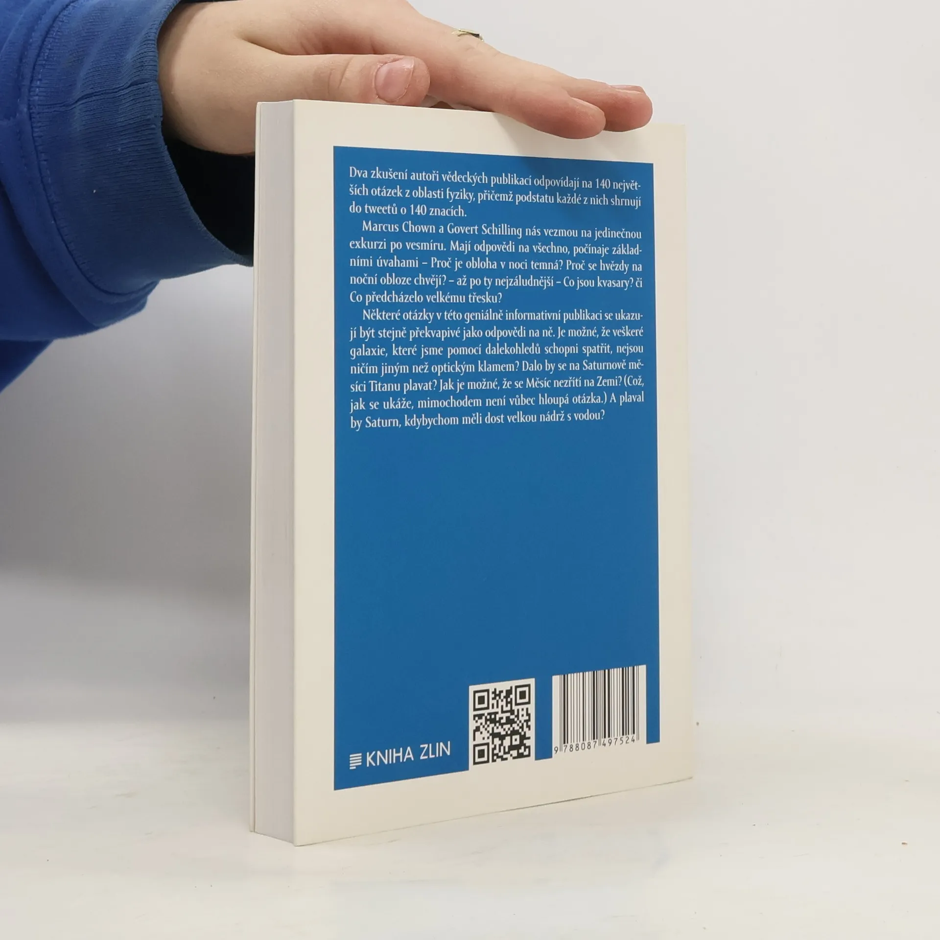 Dva zkušení autoři vědeckých publikací odpovídají na 140 největších otázek z oblasti fyziky, přičemž podstatu každé z nich shrnují do tweetů o 140 znacích. Marcus Chown a Govert Schilling nás vezmou na jedinečnou exkurzi po vesmíru. Mají odpovědi na všechno, počínaje základními úvahami – Proč je obloha v noci temná? Proč se hvězdy na noční obloze chvějí? – až po ty nejzáludnější – Co jsou kvasary? či Co předcházelo Velkému třesku? Některé otázky v této geniálně informativní publikaci se ukazují být stejně překvapivé jako odpovědi na ně. Je možné, že veškeré galaxie, které jsme pomocí dalekohledů schopni spatřit, nejsou ničím jiným než optickým klamem? Dalo by se na Saturnově měsíci Titanu plavat? Jak je možné, že se Měsíc nezřítí na Zemi? (Což, jak se ukáže, mimochodem není vůbec hloupá otázka.) A plaval by Saturn, kdybychom měli dost velkou nádrž s vodou?