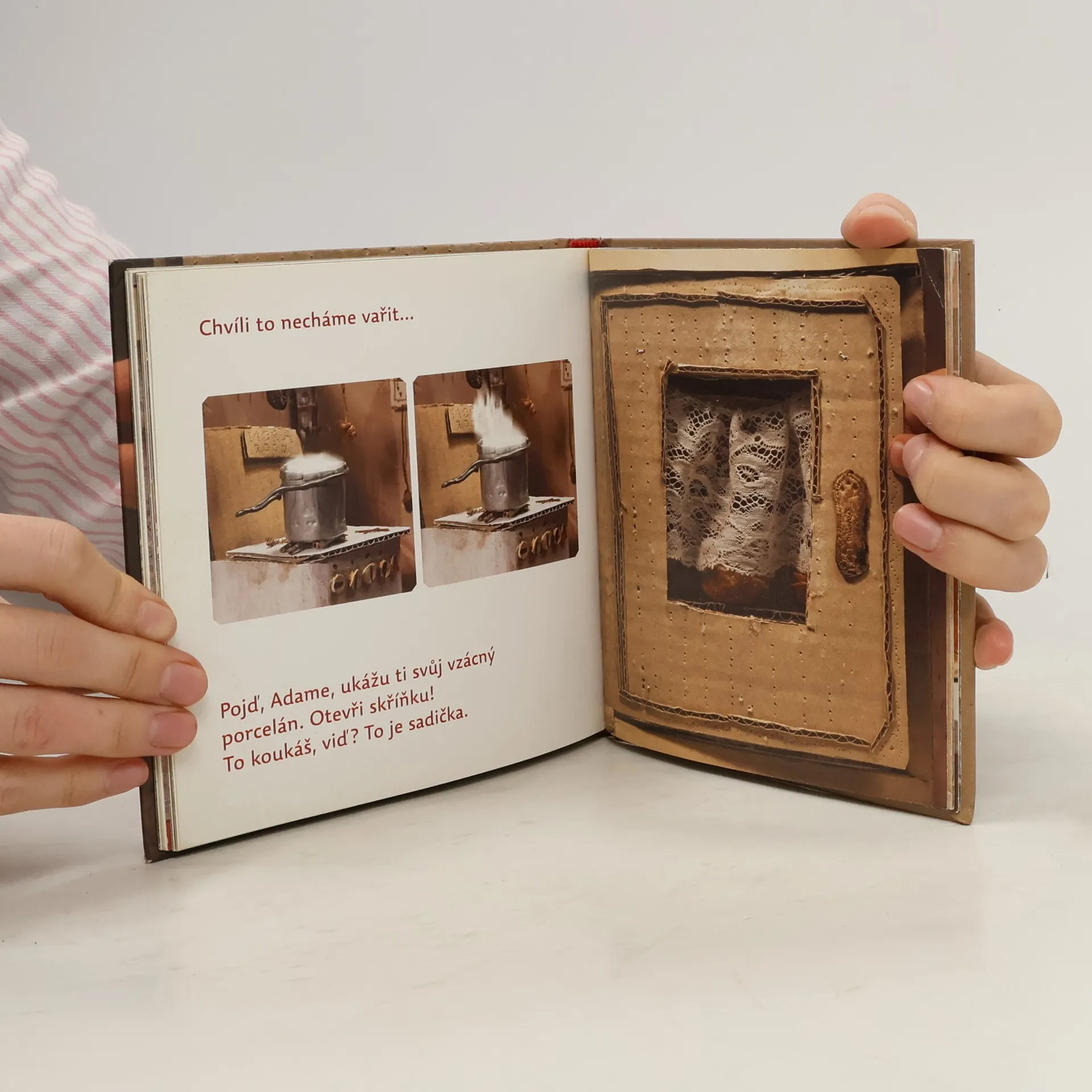 Netuctový příběh Dagmar Urbánkové je z těch, které nejdou z hlavy. Vypraví o Adamovi a rozbitém koleně. A proč by se děj nemohl odehrávat přímo pod roztrženou nohavicí? Malý svět za trhlinou kalhot sestavila autorka z miniaturních věciček: kousků pomerančové kůry, klacíků, větví, listů a samozřejmě maličkých loutek. Její scénografie nepůsobí nijak teatrálně, jsou neokázalé a vtipné a doplněné stručným, avšak dětí znalým textem.