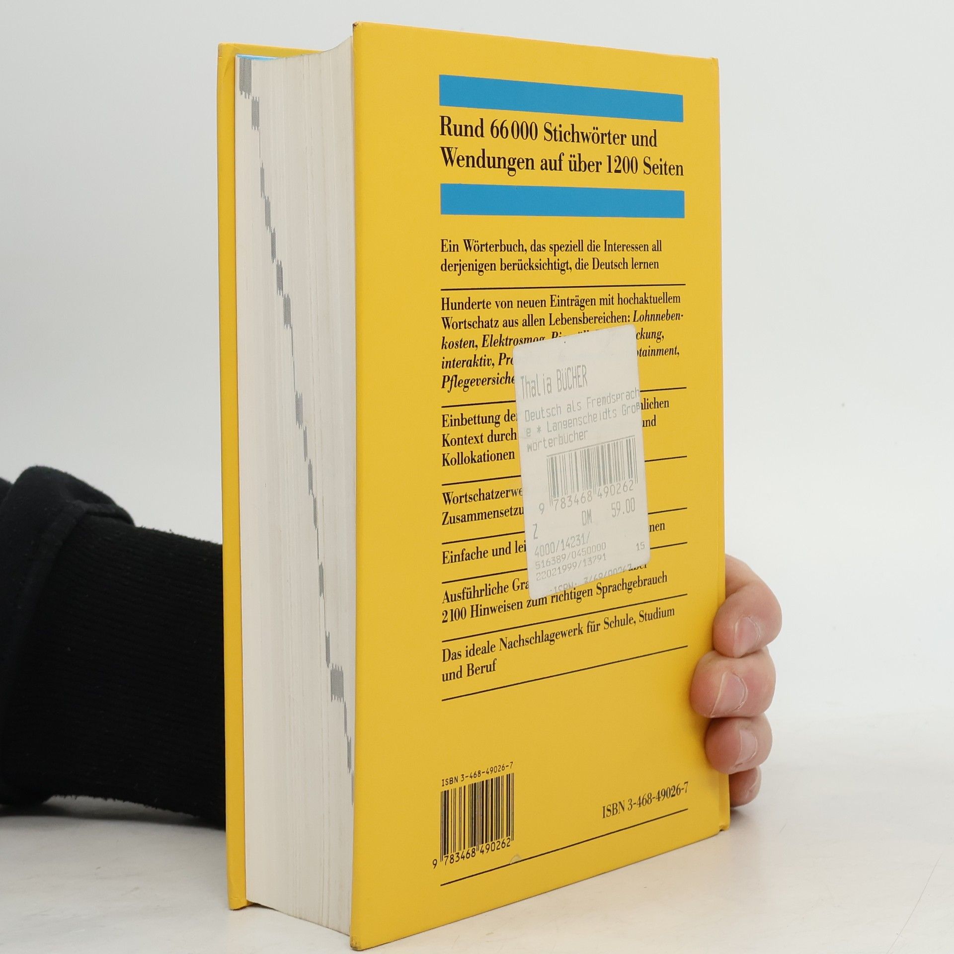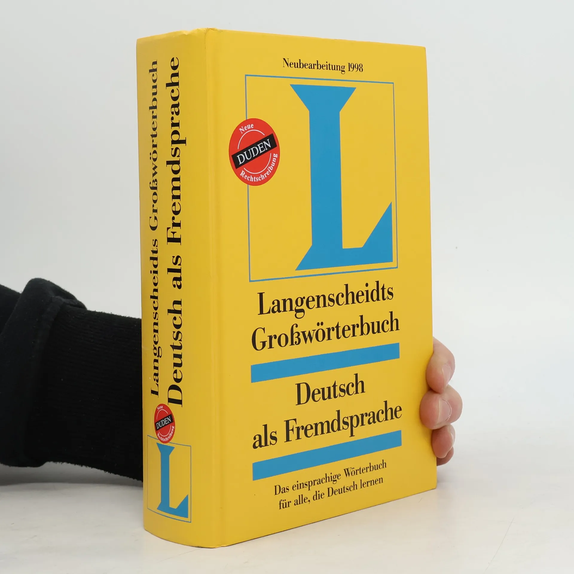 Deutsch Langenscheidts Großwörterbuch Deutsch als Fremdsprache Neubearbeitung 1998. Ein Lernerwörterbuch, das besonders den Bedürfnissen all derjenigen entgegenkommt, die Deutsch lernen. Alle Stichwörter sind leicht verständlich erklärt und in den Sprachkontext eingebunden. Es werden Einträge durch Synonyme, Beispiele, Grammatikhinweise oder Illustrationen ergänzt. Hunderte von neuen Einträgen mit hochaktuellem Wortschatz aus allen Lebensbereichen wurden aufgenommen, z.B.: interaktiv, Klimaschutz, Outsourcing, Einschaltquote, Infotain-ment, Lohnnebenkosten, Pflegeversicherung, Währungsunion.