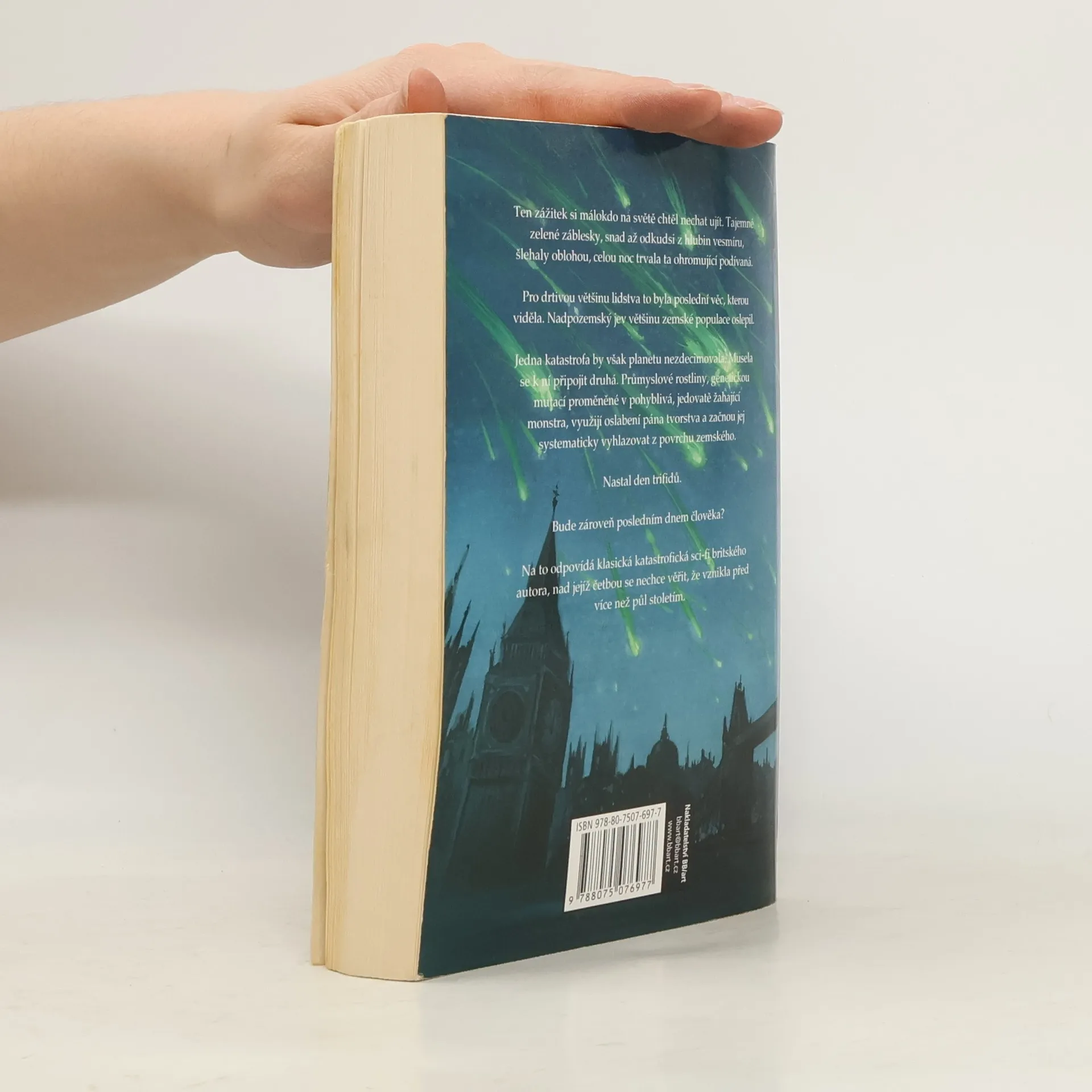 Ten zážitek si málokdo na světě chtěl nechat ujít. Tajemné zelené záblesky, snad až odkudsi z hlubin vesmíru, šlehaly oblohou, celou noc trvala ta ohromující podívaná. Pro drtivou většinu lidstva to byla poslední věc, kterou viděla. Nadpozemský jev většinu zemské populace oslepil. Jedna katastrofa by však planetu nezdecimovala. Musela se k ní připojit druhá. Průmyslové rostliny, genetickou mutací proměněné v pohyblivá, jedovatě žahající monstra, využijí oslabení pána tvorstva a začnou jej systematicky vyhlazovat z povrchu zemského. Nastal den trifidů. Bude zároveň posledním dnem člověka? Na to odpovídá klasická katastrofická sci-fi britského autora, nad jejíž četbou se nechce věřit, že vznikla před více než půl stoletím.