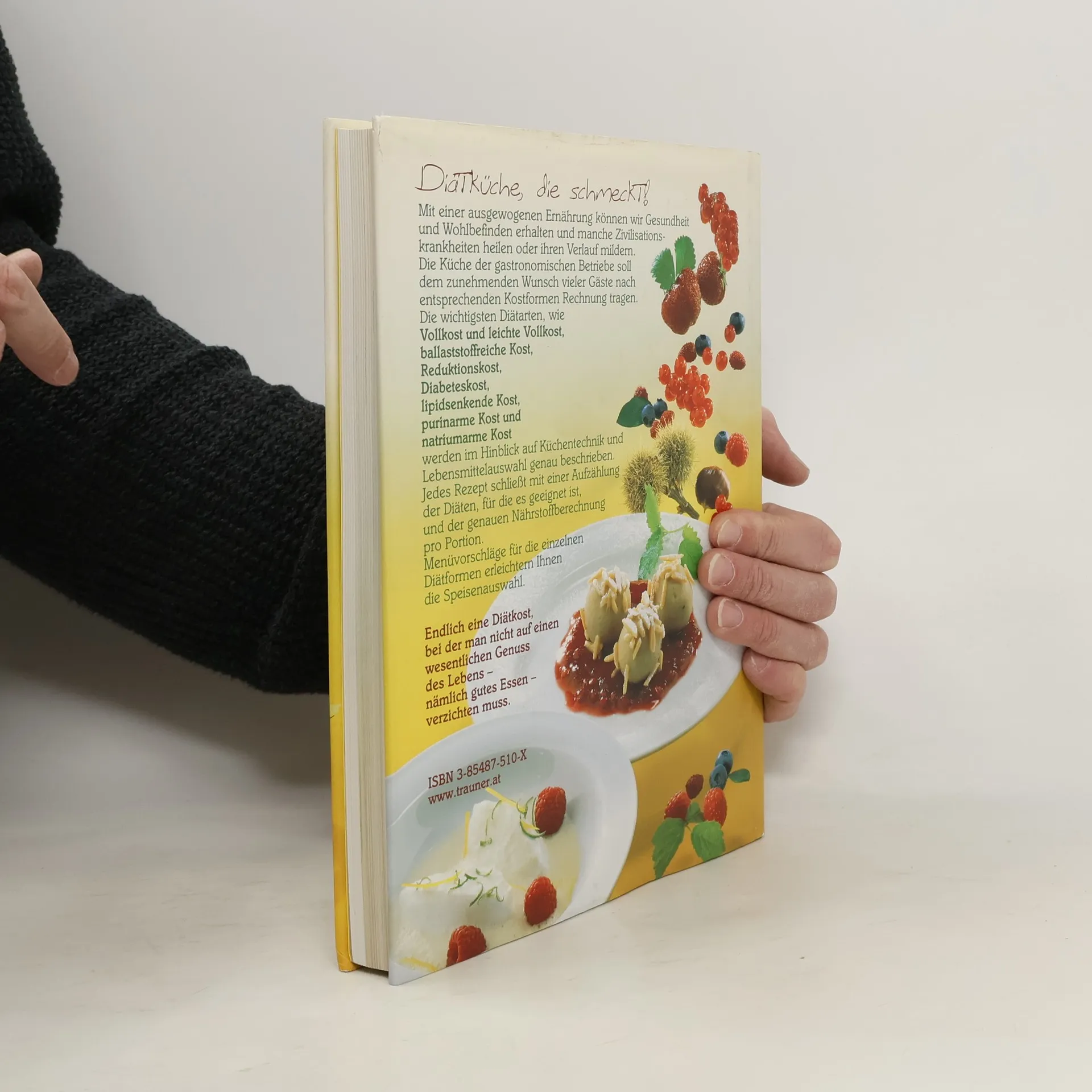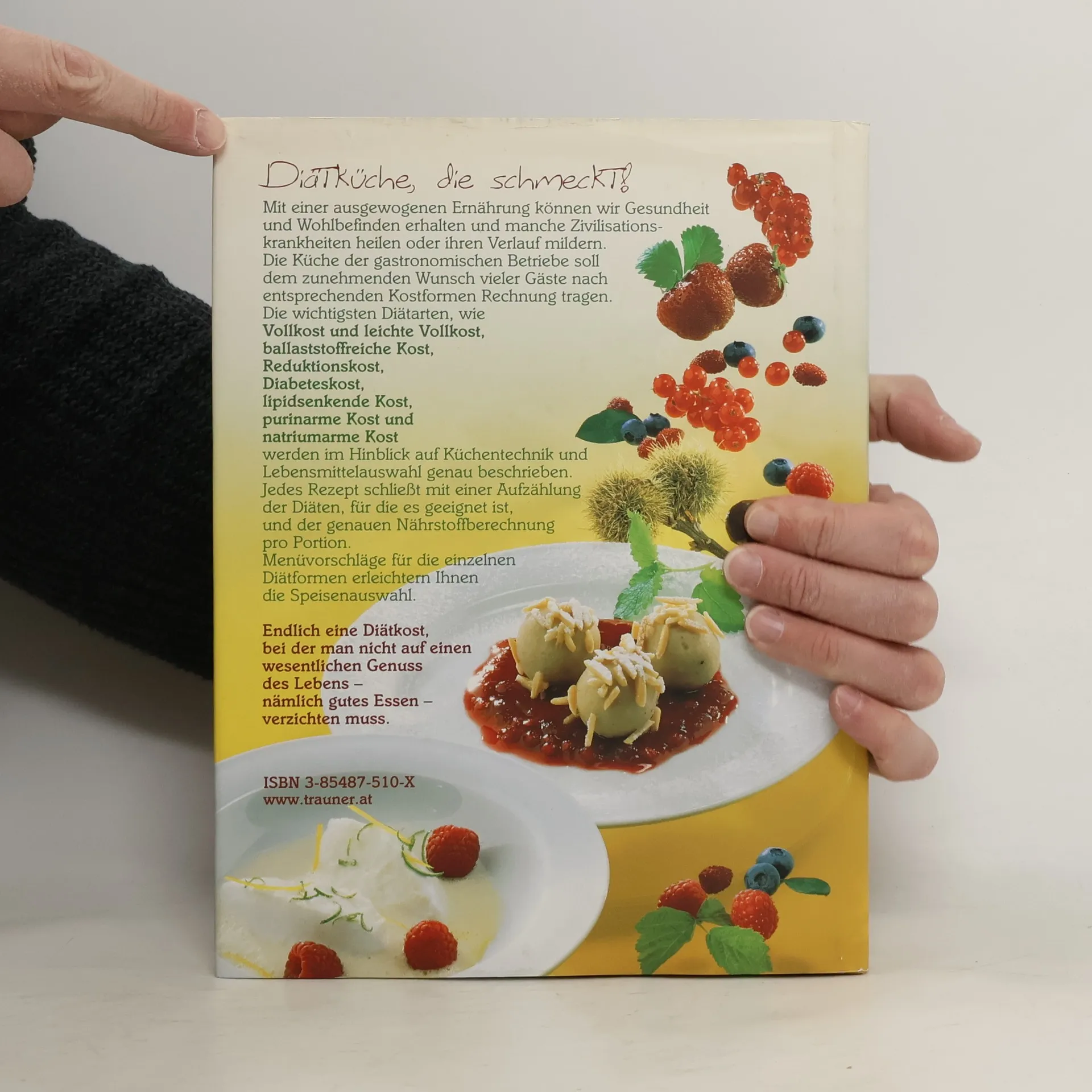 Diätküche, die schmeckt! Endlich eine Diätkost, bei der man nicht auf einen wesentlichen Genuss des Lebens, nämlich gutes Essen, verzichten muss. Die Dipl.-Diätassistentin Andrea Hofbauer und der bekannte Küchenchef Anton Frühwirth beweisen, dass Diätküche eine wahre Gaumenfreude sein kann. Die über 300 erprobten Rezepte unterscheiden sich weder im Zeit- noch im Materialaufwand von der herkömmlichen Küche. Sie sind leicht nachvollziehbar und gelingen mit Sicherheit! Was ist neu an dieser Auflage? 50 zusätzliche Rezepte werden in bewährter Weise präsentiert. Die Ernährungslehre und Diätetik wurden nach neuesten wissenschaftlichen Erkenntnissen aufbereitet. Durchgehend vierfarbig. Aus dem Inhalt Ernährung und Gesundheit; Inhaltsstoffe der Nahrung; Die ausgewogene Ernährung; Ernährung in bestimmten Lebensabschnitten; Alternative Kostformen; Richtige Ernährung bei Erkrankungen - Einführung und Grundlagen der Diätetik; Vollkost; Leichte Vollkost; Diät bei Obstipation - ballaststoffreiche Kost; Ernährung bei Übergewicht - Reduktionskost; Ernährung bei Diabetes mellitus; Diät bei Fettstoffwechselstörungen (Hyperlipidämie); Diät bei überhöhten Harnsäurewerten und Gicht - purinreduzierte Diät; Natriumarme Diät; Rezepte; Menüvorschläge