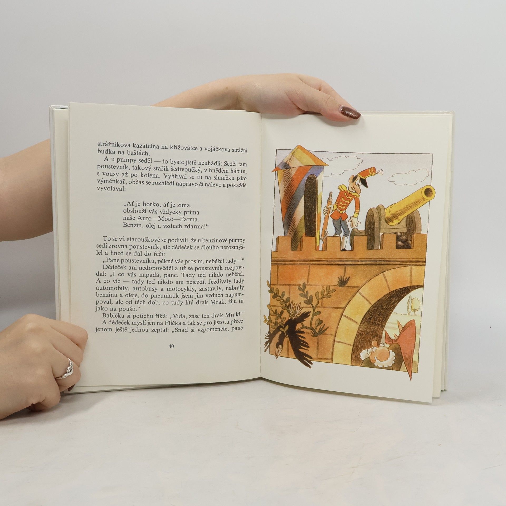 Dědeček a babičkou žili hezký život, ale bylo jim stále nějak smutno, cosi jim scházelo. Až jednou, přímo z nebe – vlastně oknem jim přiletěl do pokojíku míček. Byl to hezký, hlaďounký, kulaťoučký, ducatý, baculatý a vůbec ne ledajaký míček, a tak ho pojmenovali míček Flíček. Míček se ale zalíbil i draku Mrakovi, který ho unesl. Dědeček s babičkou ho hledají dlouho, předlouho, ale nakonec svého Flíčka za pomoci strašáka Pašáka, psíčka Pantoflíčka, ptáčka Jarabáčka přece jen najdou. Kniha je určena dětem od 5 let a vychází s původními ilustracemi Ondřeje Sekory.