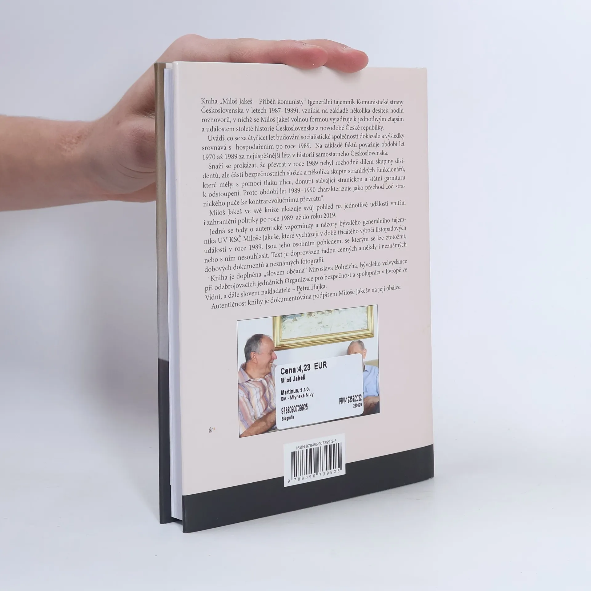Kniha „Miloš Jakeš – příběh komunisty“ vznikla na základě rozhovorů s Milošem Jakešem, generálním tajemníkem Komunistické strany Československa v letech 1987-1989. Jakeš se vyjadřuje k významným událostem stoleté historie Československa a České republiky, hodnotí čtyřicet let budování socialistické společnosti a porovnává výsledky s hospodařením po roce 1989. Považuje období 1970-1989 za nejúspěšnější léta v historii samostatného Československa a tvrdí, že převrat v roce 1989 nebyl dílem disidentů, ale spíše částí bezpečnostních složek a stranických funkcionářů, kteří s pomocí veřejného tlaku donutili stávající garnituru k odstoupení. Také charakterizuje období 1989-1990 jako přechod „od stranického puče ke kontrarevolučnímu převratu“. Kniha zahrnuje Jakešovy názory na události po roce 1989 až do roku 2019, přičemž obsahuje autentické vzpomínky, které mohou čtenáře oslovit nebo vyvolat nesouhlas. Text je doplněn cennými historickými dokumenty a fotografiemi. Kniha obsahuje také „slovo občana“ Miroslava Polreicha a komentář nakladatele Petra Hájka, přičemž autentičnost je potvrzena podpisem Miloše Jakeše na obálce.