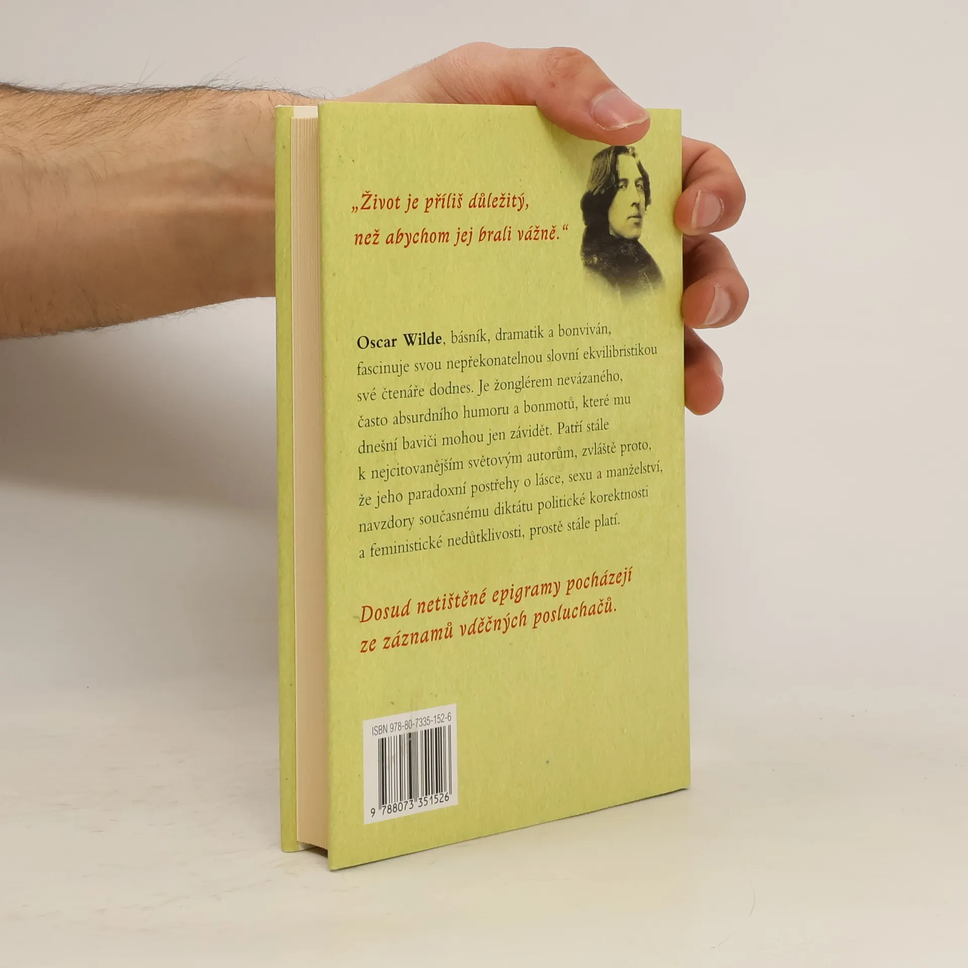 Oscar Wilde (1854 - 1900), básník, dramatik a bonviván, fascinuje svou nepřekonatelnou slovní ekvilibristikou své čtenáře dodnes. Je žonglérem nevázaného, často absurdního humoru a bonmotů, které mu dnešní baviči mohou jen závidět. Patří stále k nejcitovanějším světovým autorům, zvláště proto, že jeho paradoxní postřehy o lásce, sexu a manželství, navzdory současnému diktátu politické korektnosti a feministické nedůtklivosti, prostě stále platí. "Do umění života jsem vložil svou genialitu, do svého díla jenom svůj talent." "Život je příliš důležitý, než abychom jej brali vážně." Kromě bonmotů a průpovědí, jejichž výběr přináší tato kniha, patří k nejslavnějším ze spisovatelových děl jeho jediný román Obraz Doriana Graye, divadelní hry Salome, Ideální manžel a Jak je důležité míti Filipa a také pohádky (např. Šťastný princ a jiné pohádky).