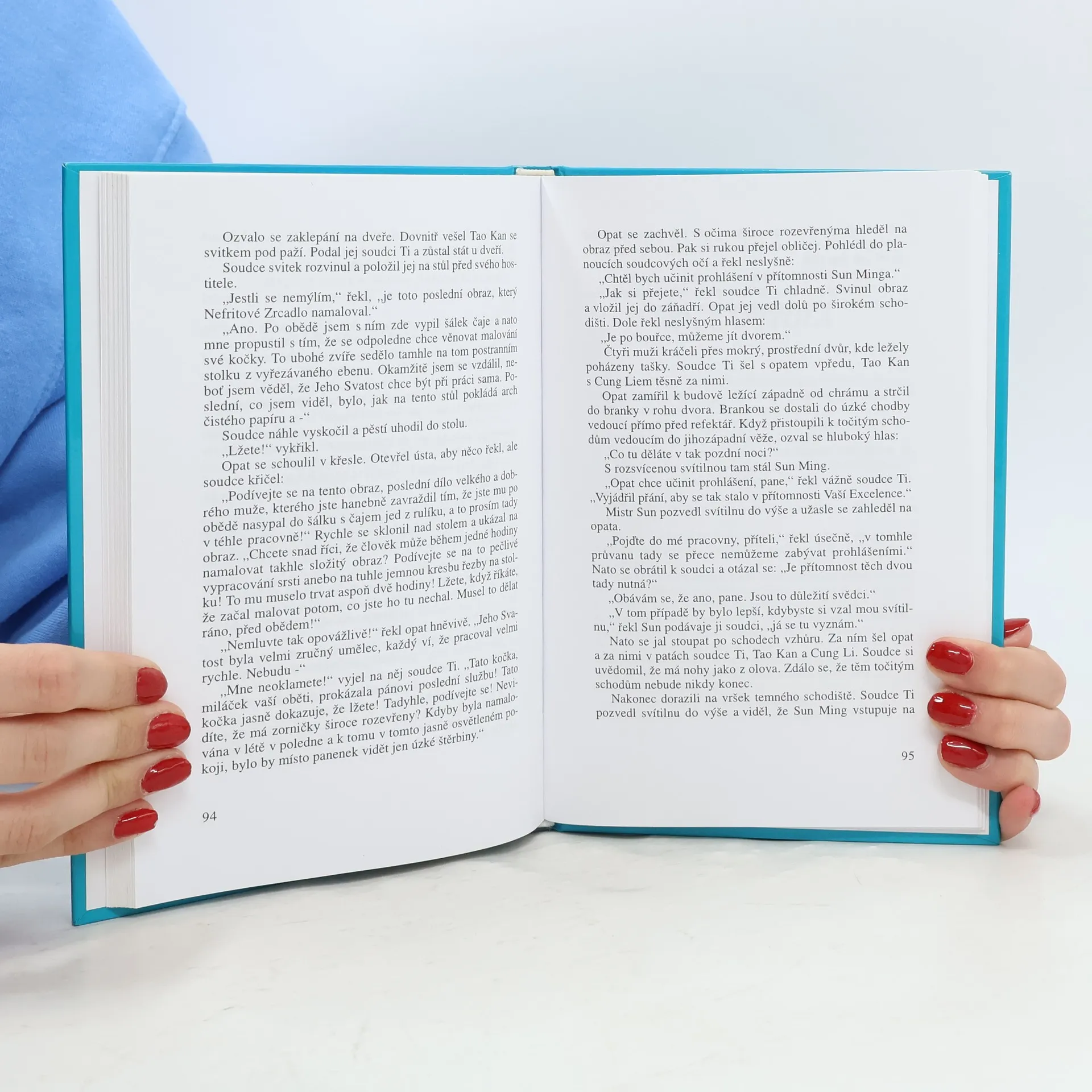 Soudce Ti musí se svým pomocníkem Tao Kanem kvůli bouři přenocovat v taoistickém klášteře v horách Chan-jüanu a vyřeší zde tři záhadné případy. Případ balzamovaného opata, případ zbožné panny a případ nevraživého mnicha. Zajímavé na této knize je, že autor převzal základní motiv (oči kočky), který je klíčem k rozuzlení záhadné smrti opata, z anekdoty o slavném básníkovi Ou-Jang Siu (1007 – 1072). Básník totiž vlastnil starý obraz kočky mezi pivoňkami, o němž prohlásil, že musel být namalován v poledne, protože kočka má přimhouřené oči a květy pivoňky jsou povadlé. Tradiční je též kompozice vyprávění, kdy soudce Ti, po vzoru klasických čínských detektivních příběhů, řeší několik případů najednou. 4. vydání vyšlo v roce 2007 - ISBN: 978-80-87010-12-9