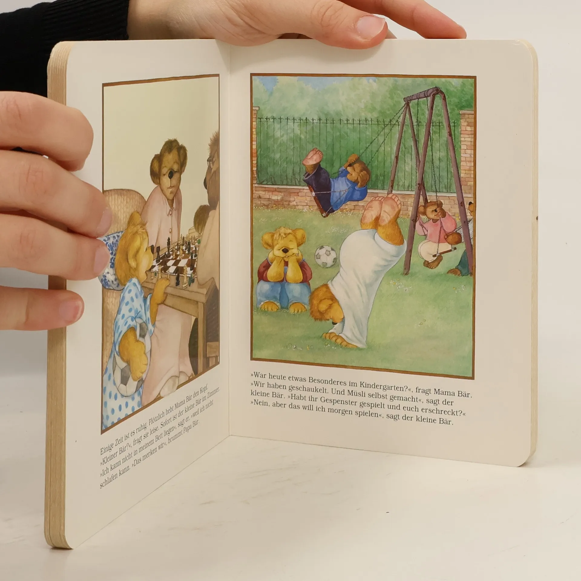Jeden Abend, wenn er eigentlich schlafen soll, ist der kleine Bär putzmunter. Einschlafen kann er erst bei Mama und Papa im großen Bett. Bis er herausfindet, daß er seine Kuscheltiere nicht Nacht für Nacht allein lassen kann