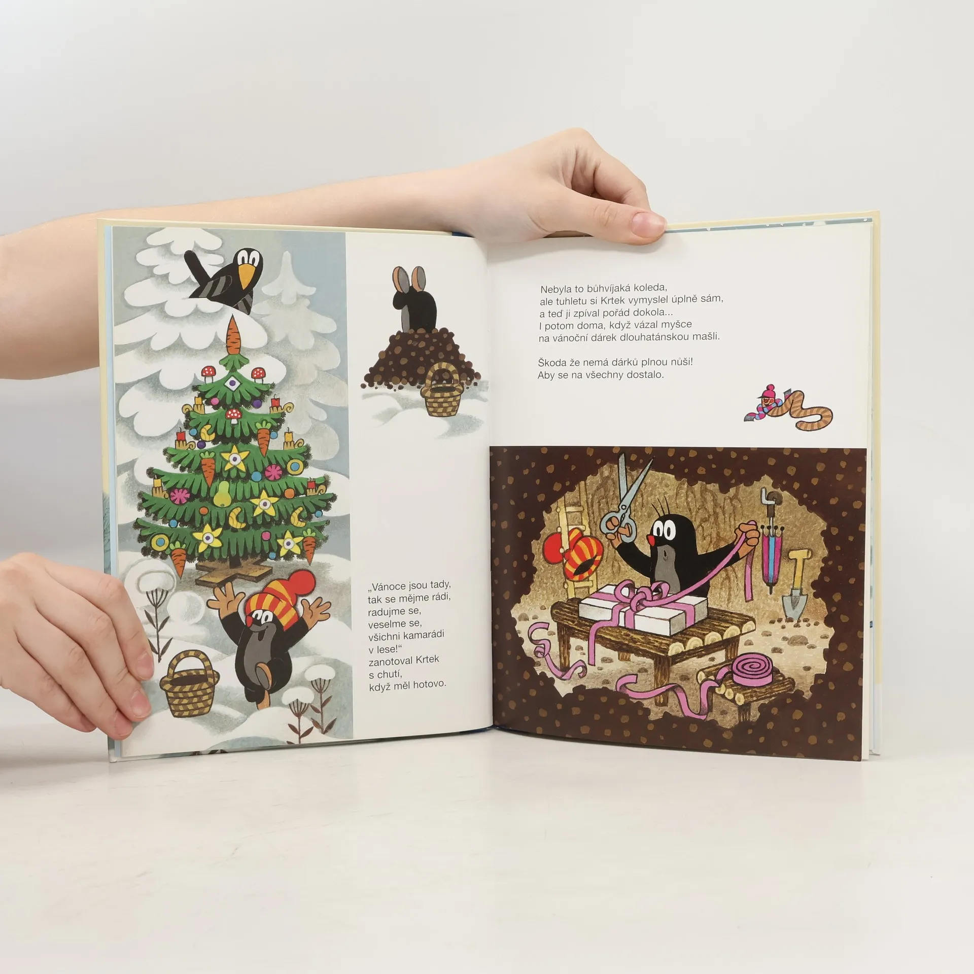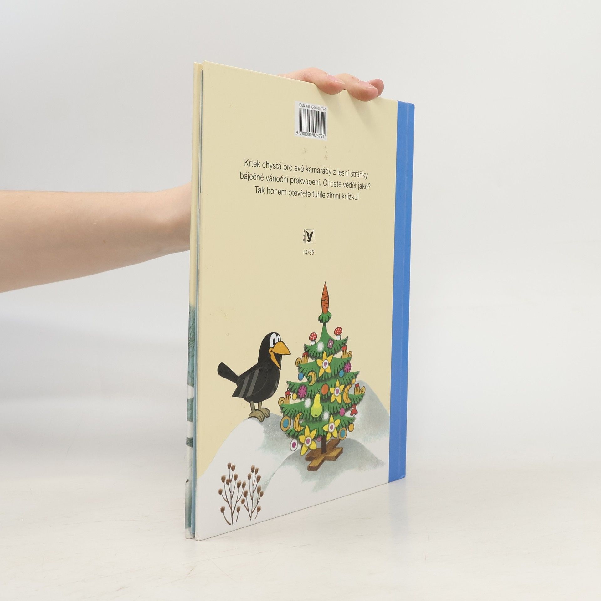 Byla zima, zvířátka ještě tvrdě spala ve svých pelíšcích. Ale Krtek ne, ten už běhal venku. Chtěl přichystat pro své kamarády z lesní stráňky báječné vánoční překvapení. A ukázalo se, že to nebude tak jednoduché, jak se zpočátku zdálo. Z dálky ho totiž pozorovala škodolibá tetka vrána. Jakmile spatřila krásný vánoční stromeček ozdobený dobrotami, hned na něj dostala zálusk. Krtek si však se známou zlodějkou snadno poradil. Chcete vědět jak? Tak honem otevřete tuhle zimní knížku! 1. vydání.