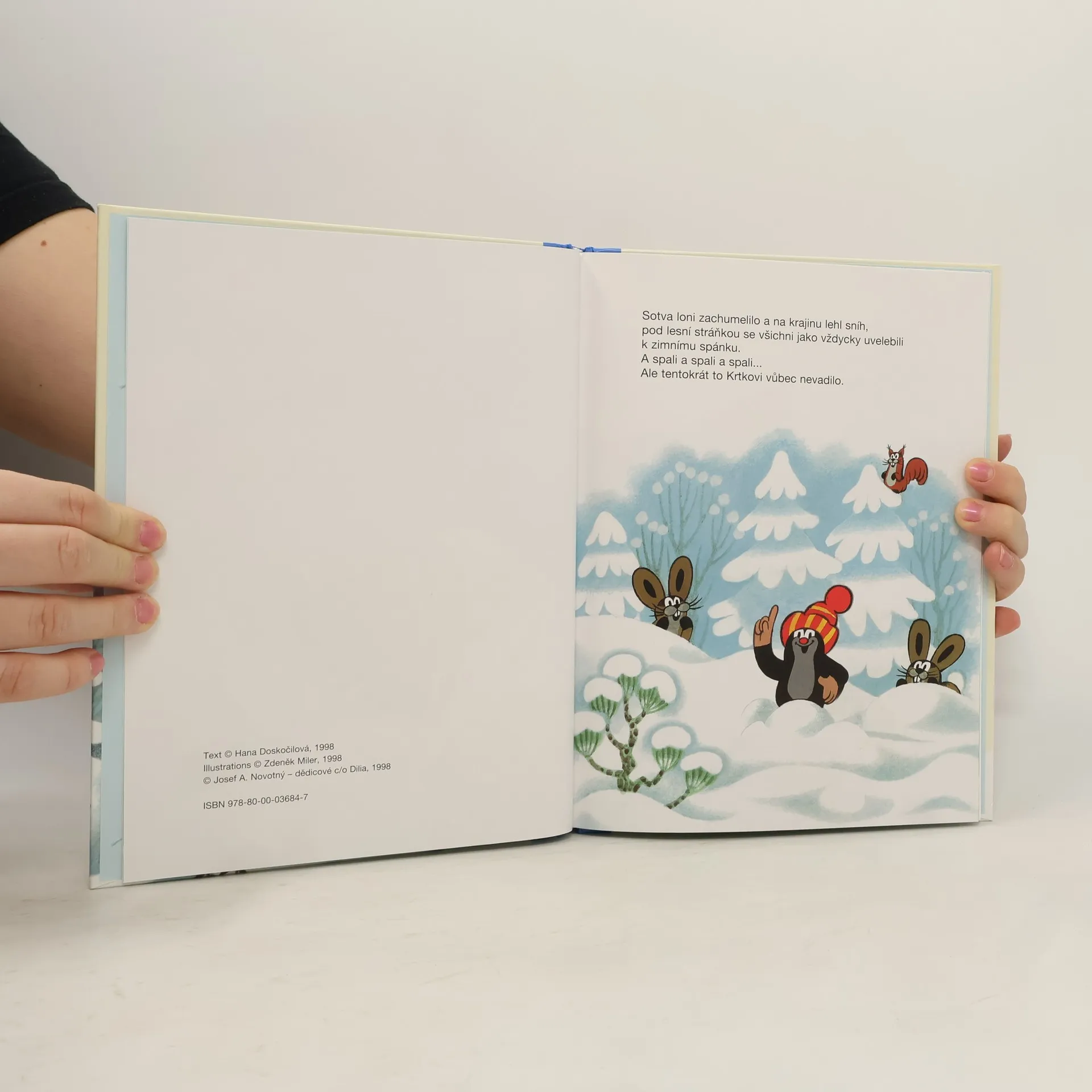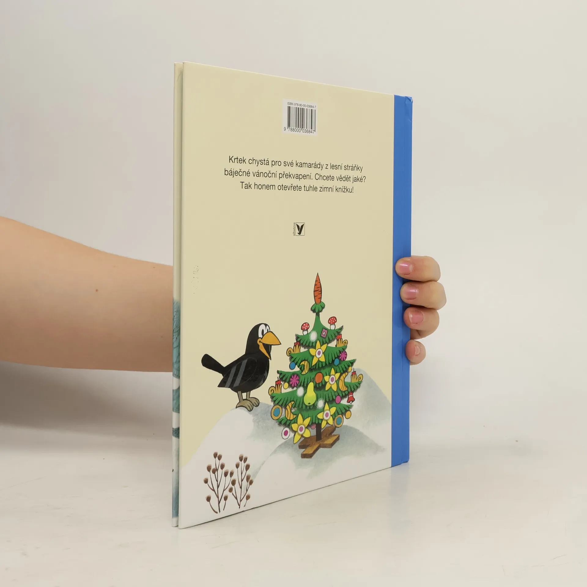 Byla zima, všude sníh, a zvířátka tvrdě spala ve svých teplých pelíšcích. Krtek nikoliv, ten běhal venku. Chtěl přichystat pro své kamarády z lesní stráňky báječné vánoční překvapení. Ukázalo se však, že to nebude tak jednoduché, jak se zpočátku zdálo. Zdálky ho totiž pozorovala škodolibá tetka vrána. Jakmile spatřila krásný vánoční stromeček ozdobený dobrotami, hned na něj dostala zálusk. Krtek si ale se známou zlodějkou snadno poradil. Chcete vědět jak? Tak honem otevřete tuhle zimní knížku!