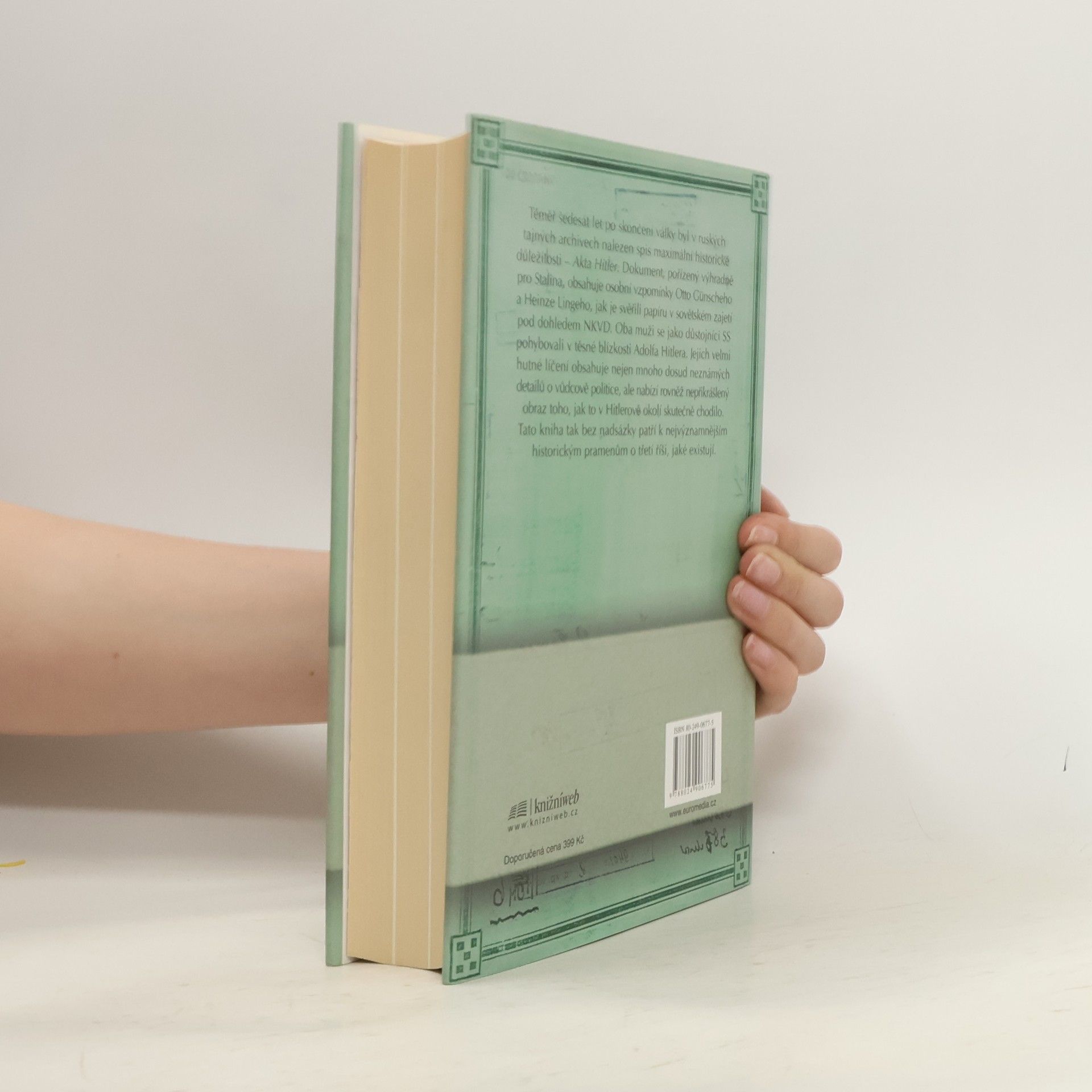 Téměř šedesát let po skončení války byl v ruských archivech nalezen spis maximální historické důležitosti: Akta Hitler. Dokument, pořízený výhradně pro Stalina, obsahuje osobní vzpomínky Otto Günscheho a Heinze Lingeho, jak je svěřili papíru v sovětském zajetí pod dohledem NKVD. Oba muži se jako důstojníci SS pohybovali v největší blízkosti Adolfa Hitlera. Jejich velmi hutné líčení obsahuje nejen mnoho dosud neznámých detailů o vůdcově politice, ale nabízí rovněž nepřikrášlený obraz toho, jak to v Hitlerově okolí skutečně chodilo. Akta Hitler tak bez nadsázky patří k nejvýznamnějším historickým pramenům o třetí říši, jaké existují.