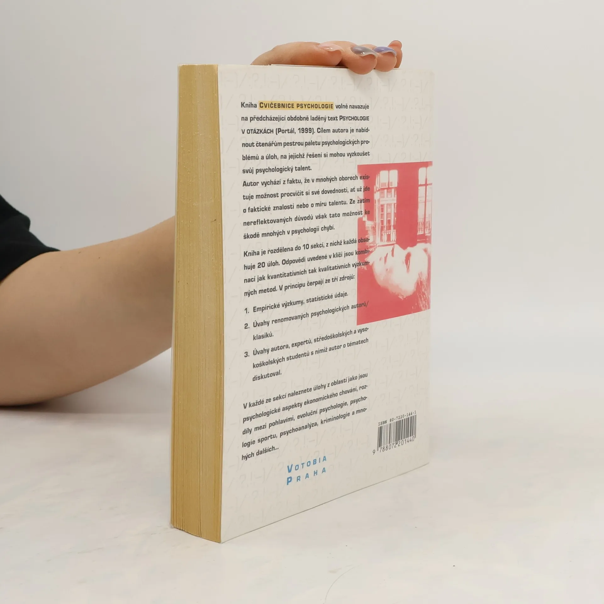 Podtitul: "Úlohy z praktické psychologie" Soubory nejsou uspořádány tematicky; v každém je dvacet otázek z nejrůznějších psychologckých oborů i psychologické problematiky (aspekty ekonomického chování, rozdíly mezi pohlavími, evoluční psychologie, psychoanalýza, ale i kriminologie, psychologie sportu aj.). U některých otázek neexistuje jen jedno správné řešení; v závorce je proto uvedeno číslo, které označuje množství přijatelných možností alternativního výkladu. Za každým souborem pak následuje klíč, který obsahuje odpovědi a jejich zvůvodnění, případně ještě autorovy další poznámky, citáty z děl známých psychologů (ale nejen jich), odkazy na literaturu a pramen odkud autor otázku nebo problém čerpal. Jako zdroje autor vymezuje empirické výzkumy a statistické údaje, dále úvahy renomovaných psychologů, vlastní úvahy, případně i rozbory pořízené v rozhovorech se studenty. Autor naznačuje i předpoklad, že by takto uspořádané úlohy mohly být použity jako testy u přijímacích zkoušek na vysokoškolské studium příslušných oborů. - Cvičebnice volně navazuje na autorovu předchozí knihu Psychologie v otázkách.