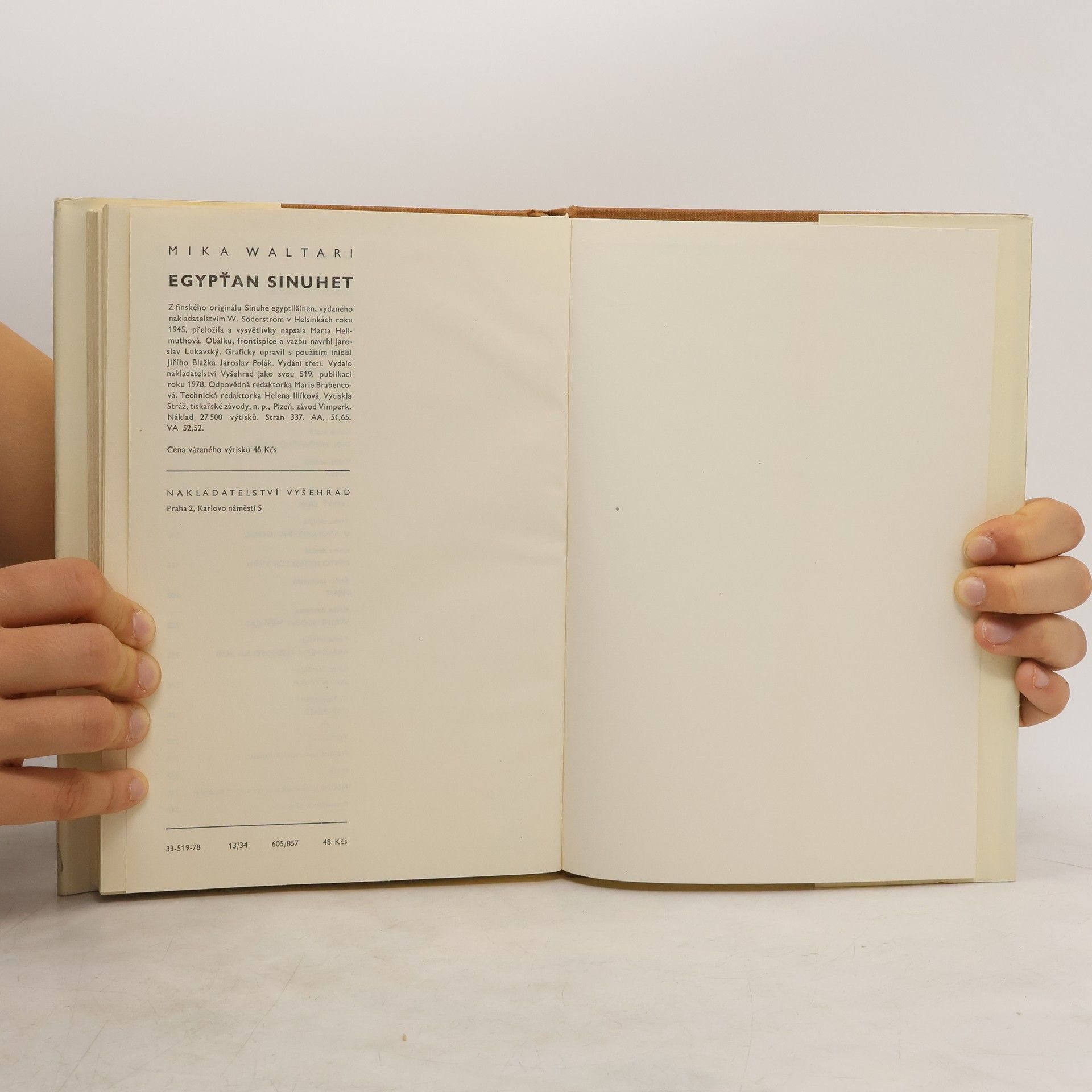 Sinuhet je dítě neznámého původu. Připlul ke své nevlastní matce Kipě a otci Senmutovi v proutěném košíku po řece. Učil se v chrámě Amonově a stal se jako otec lékařem. Dobrodružství, která zažil, jsou četná. A tím nejpovolanějším, kdo by nám o nich měl povědět, je on sám. 33-519-78