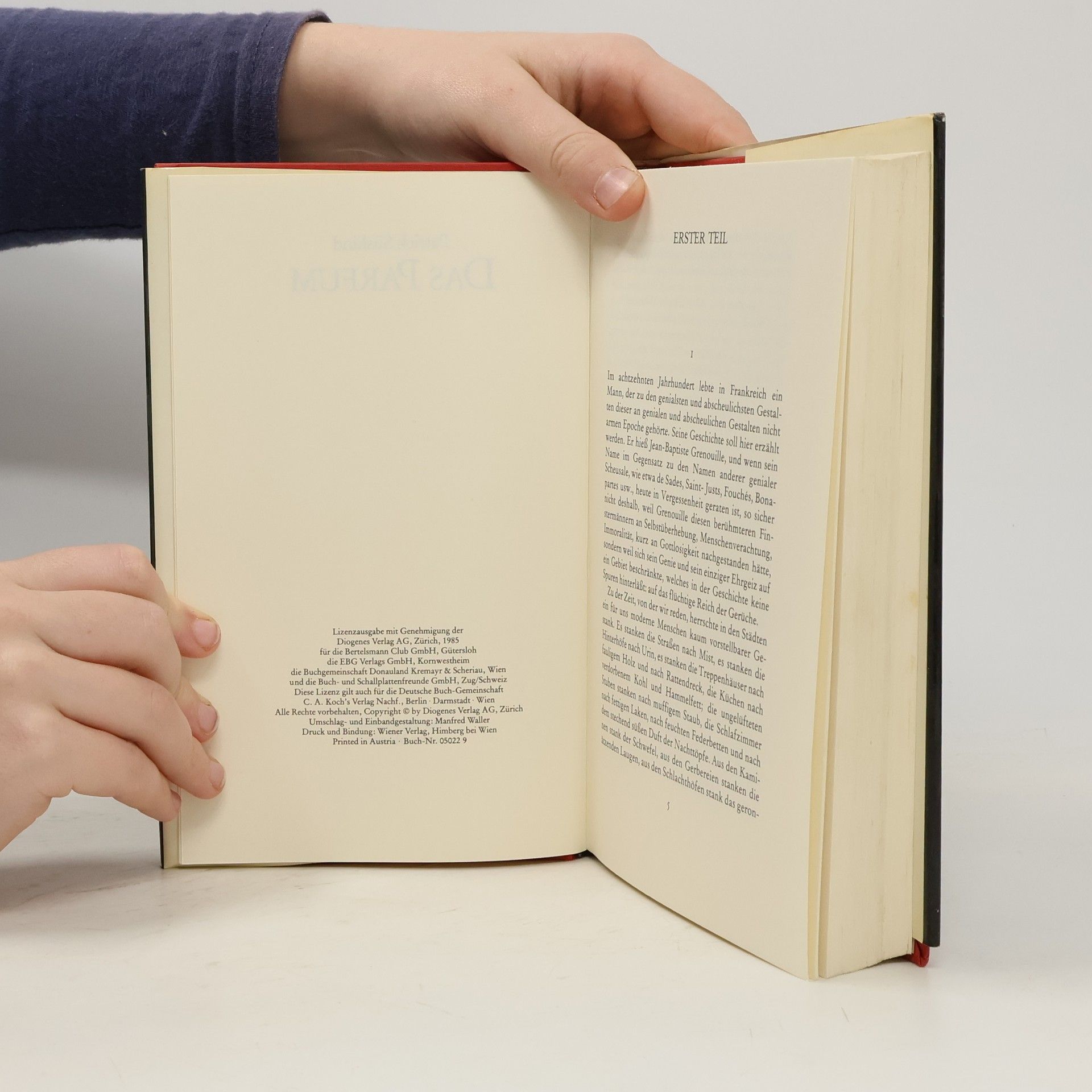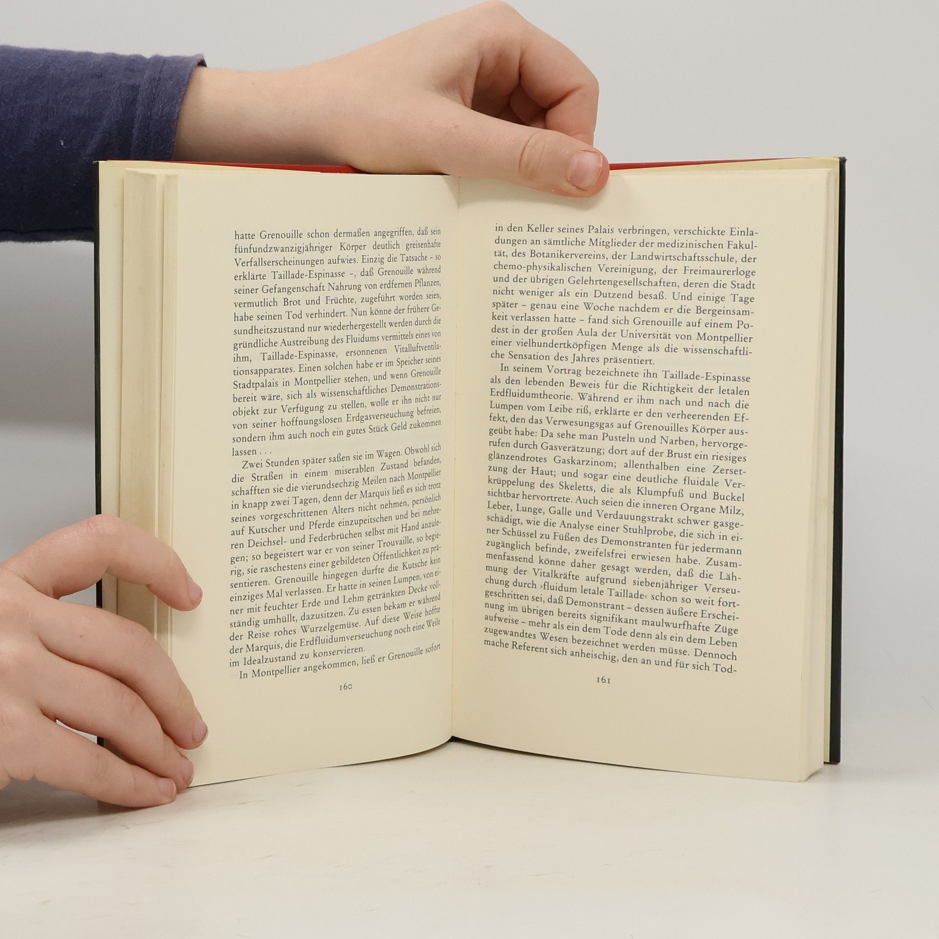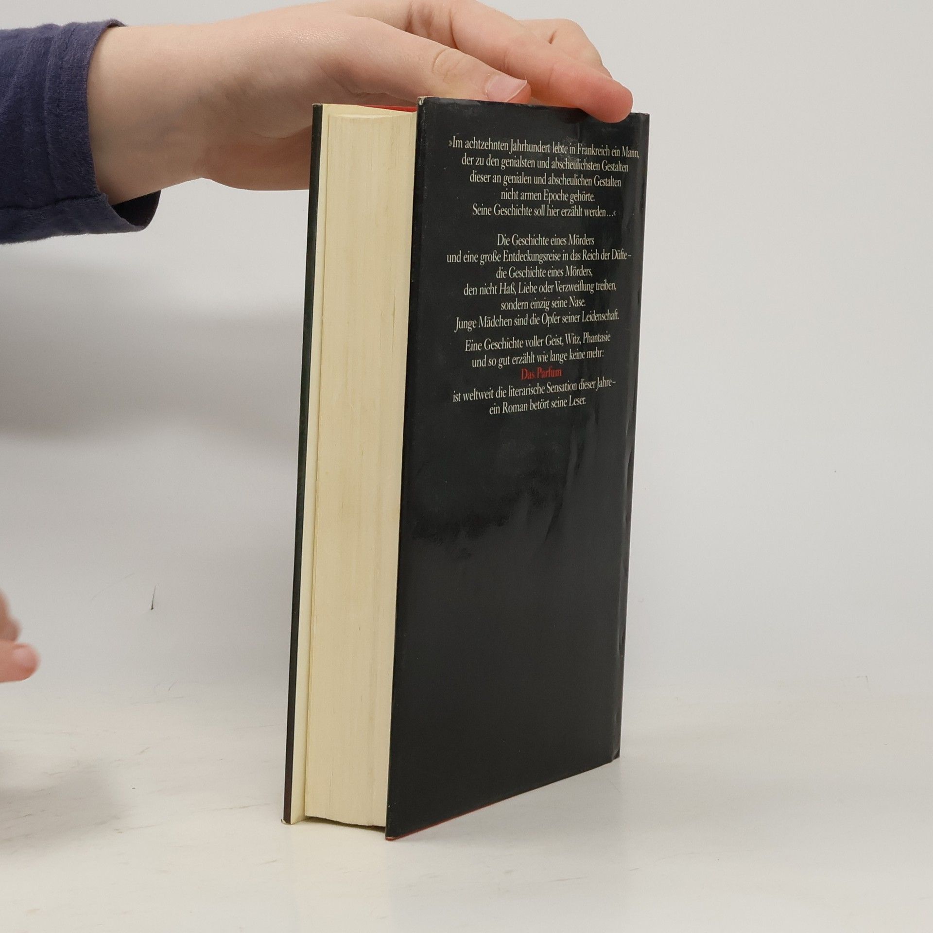 'Von Jean-Baptiste Grenouille, dem finsteren Helden, sei nur verraten, daß er 1738 in Paris, in einer stinkigen Fischbude, geboren wird. Die Ammen, denen das Kerlchen an die Brust gelegt wird, halten es nur ein paar Tage mit ihm aus: Er sei zu gierig, außerdem vom Teufel besessen, wofür es untrügliche Indizien gebe: den fehlenden Duft, den unverwechselbaren Geruch, den Säuglinge auszuströmen pflegen.'