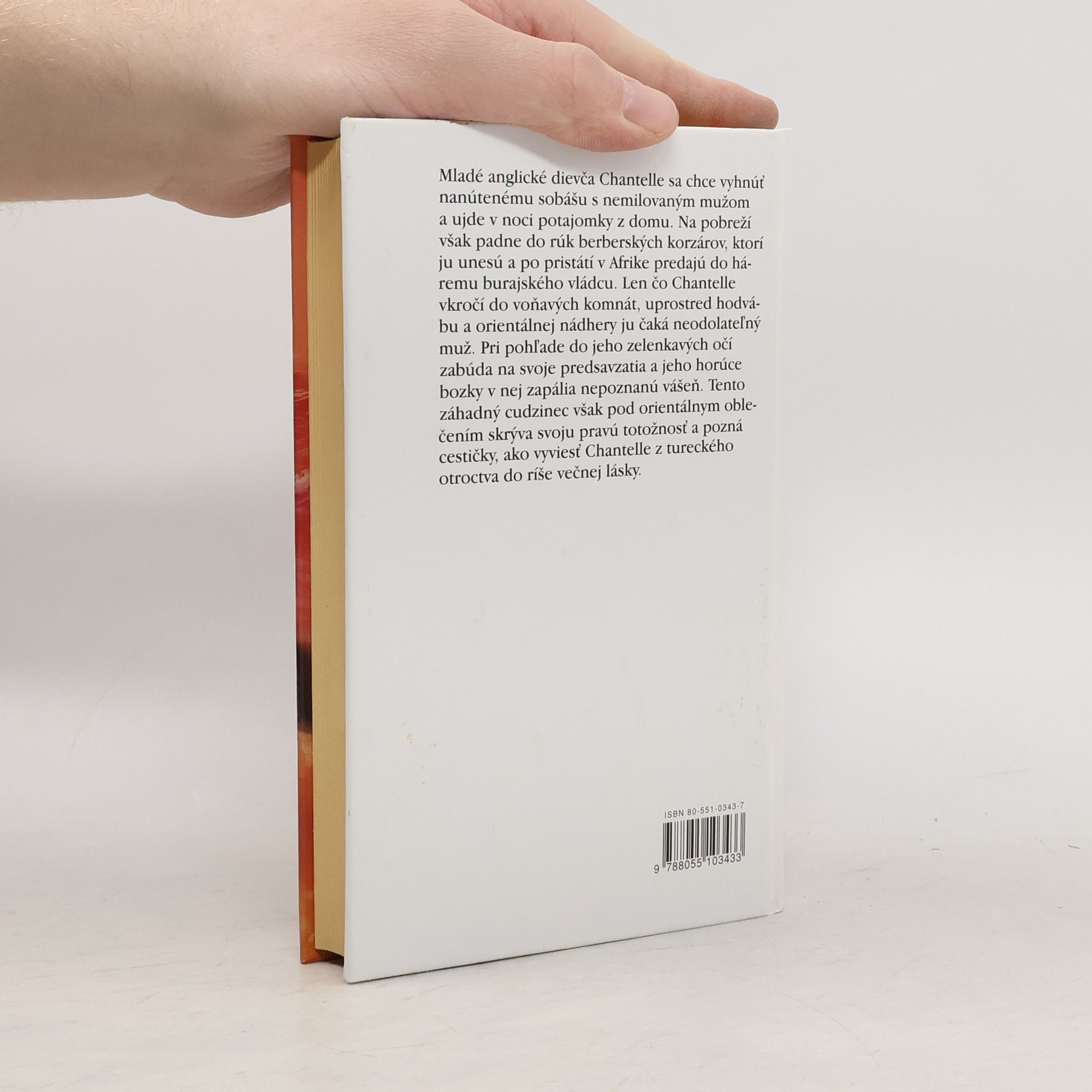 Mladé anglické dievča Chantelle sa chce vyhnúť nanútenému sobášu s nemilovaným mužom a ujde v noci potajomky z domu. Na pobreží však padne do rúk berberských korzárov, ktorí ju unesú a po pristátí v Afrike predajú do háremu burajského vládcu. Len čo Chantelle vkročí do voňavých komnát, uprostred hodvábu a orientálnej nádhery ju čaká neodolateľný muž. Pri pohľade do jeho zelenkavých očí zabúda na svoje predsavzatia a jeho horúce bozky v nej zapália nepoznanú vášeň. Tento záhadný cudzinec však pod orientálnym oblečením skrýva svoju pravú totožnosť a pozná cestičky, ako vyviesť Chantelle z tureckého otroctva do ríše večnej lásky.