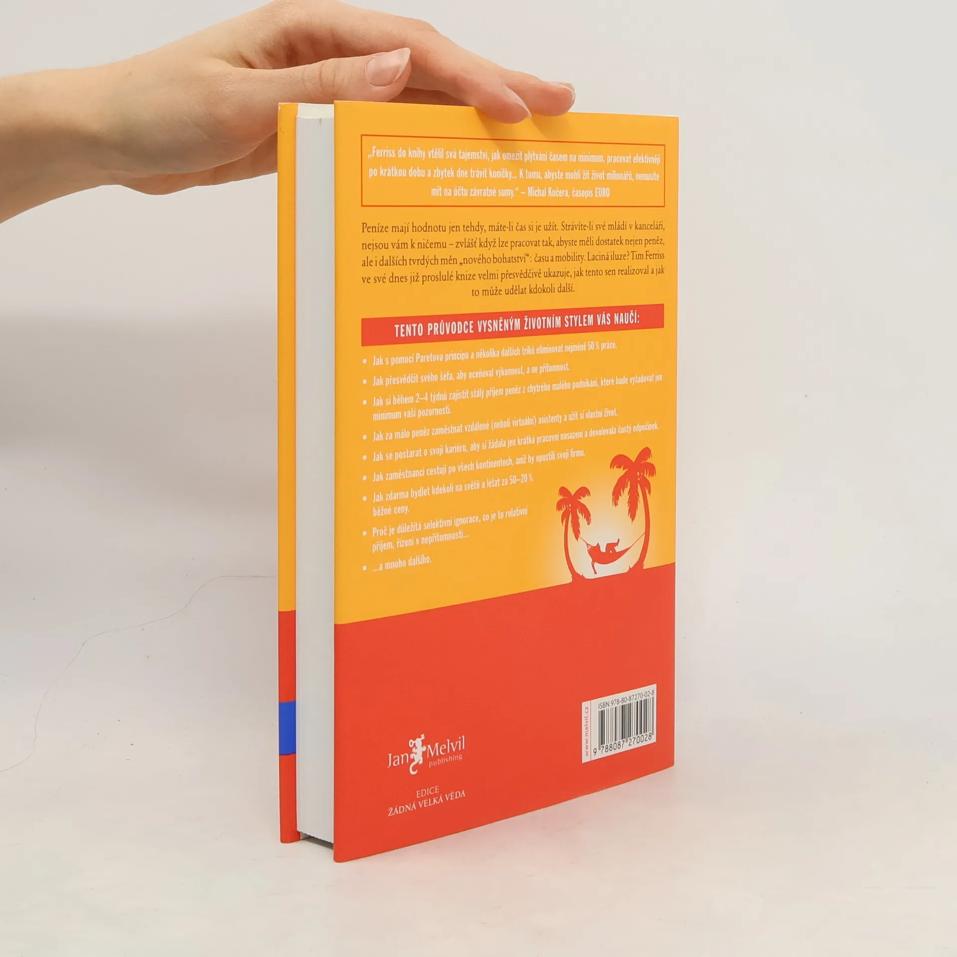 Peníze mají hodnotu jen tehdy, máte-li čas si je užít. Strávíte-li své mládí v kanceláři, nejsou vám k ničemu zvlášť když lze pracovat tak, abyste měli dostatek nejen peněz, ale i dalších tvrdých měn nového bohatství: času a mobility. Laciná iluze? Tim Ferriss ve své dnes již proslulé knize velmi přesvědčivě ukazuje, jak tento sen realizoval a jak to může udělat kdokoli další. Kniha je světovým bestsellerem a vyšla v 35 zemích.