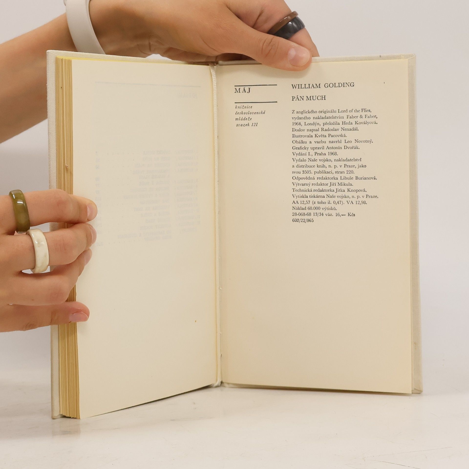 Románová prvotina anglického spisovatele (básníka, romanopisce a dramatika), která získala autorovi přední místo nejen v současné anglické, ale i ve světové tvorbě. Román, který autor (jako všechny své prózy) nazývá bájí nebo mýtem a pro který autor doslovu navrhuje termín symbolické podobenství. Příběh zasazený do utopistického rámce ne příliš vzdálené budoucnosti. Na pustém ostrově se zachrání část chlapců, kteří byli při letecké evakuaci z atomicky zasažené Británie vojensky napadeni. Chlapci čekají na vysvobození a pokoušejí se žít v nějaké životaschopné organizaci. Nejprve si vybudují jakousi ideální společnost na základě demokratických principů, vštípených rodinou a školou, ale vše se začne hroutit, jakmile je třeba, aby se vydělili „lovci“ symbolizující barbarskou živočišnou touhu po krvi. Autor zde předvádí svou vizi společnosti a odvěký svár dobra se zlem v lidském nitru.