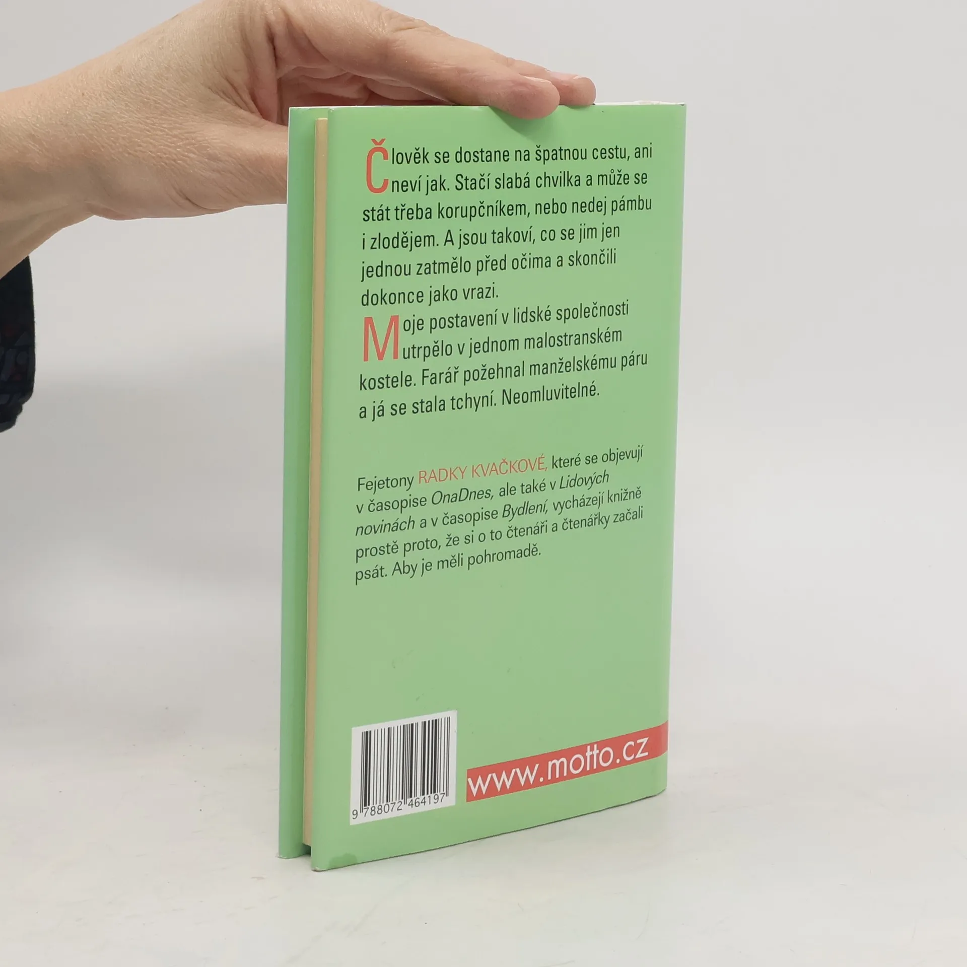 Člověk se dostane na špatnou cestu, ani neví jak. Stačí slabá chvilka a může se stát třeba korupčníkem, nebo nedej pámbu i zlodějem. A jsou takoví, co se jim jen jednou zatmělo před očima a skončili dokonce jako vrazi. Moje postavení v lidské společnosti utrpělo v jednom malostranském kostele. Farář požehnal manželskému páru a já se stala tchyní. Neomluvitelné.
