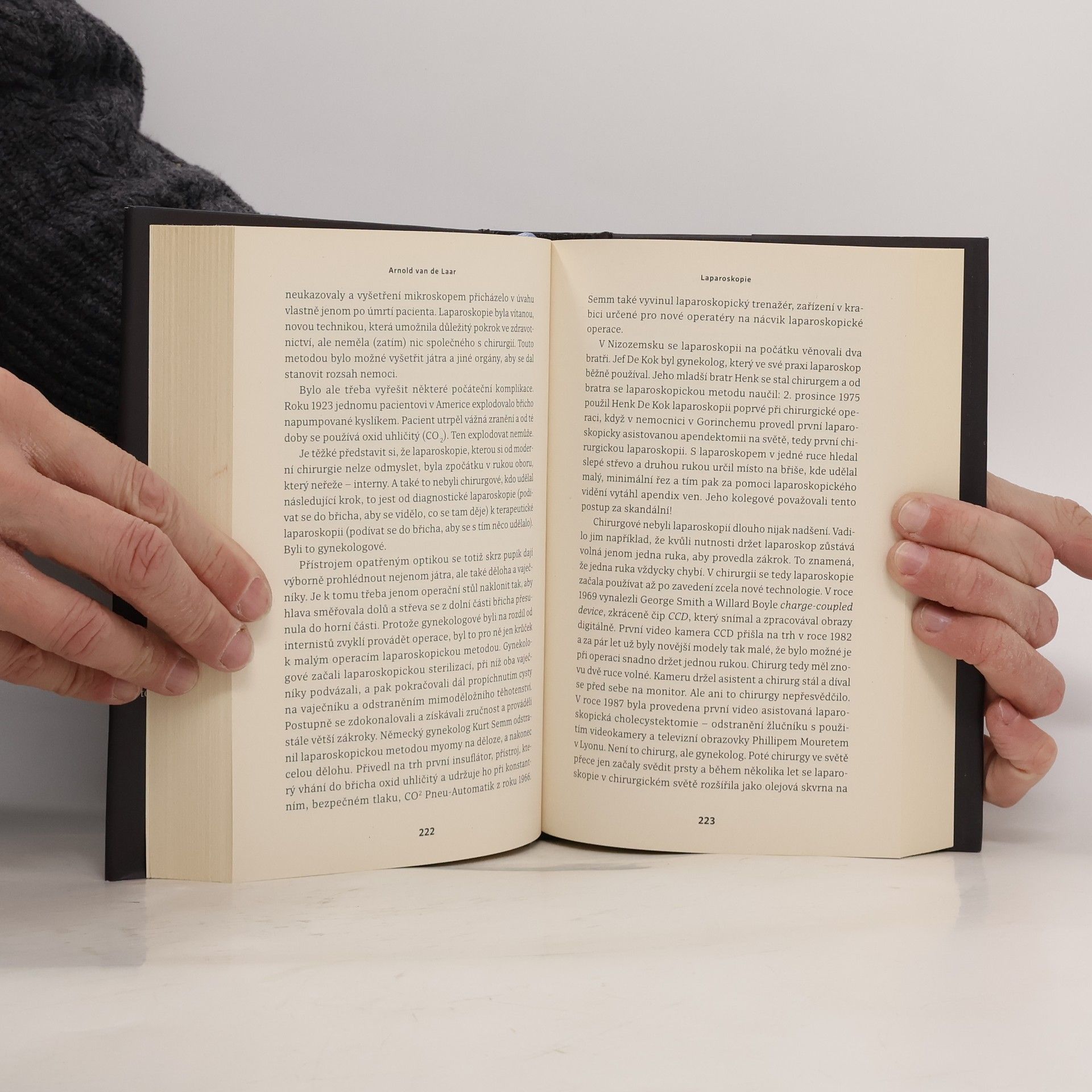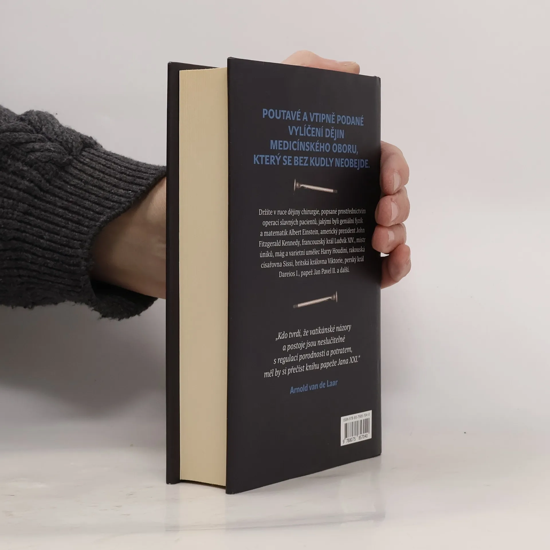 Nizozemský lékař Arnold van de Laar líčí dějiny chirurgie zasvěcenému i laickému čtenáři se smyslem pro detail i anekdotickou zkratku. Zvolil k tomu případy proslulých pacientů, jako byl geniální fyzik a matematik Albert Einstein, americký prezident John Fitzgerald Kennedy, francouzský král Ludvík XIV., mistr úniku, mág a varietní umělec Harry Houdini, rakouská císařovna Sisi, britská královna Viktorie, perský král Dareios, papež Jan Pavel II. a další. Ve 29 kapitolách sledujeme napínavé příběhy, zdárné zákroky i zákroky méně podařené. Od první kapitoly popisující čin chirurga-amatéra, amsterdamského kováře Jana De Doota ve „zlatém“ sedmnáctém století, až po výjimečnou operaci paúhoře elektrického prochází čtenář dobami, kdy „nejdůležitějším atributem v úspěšné praxi… byl rychlý kůň“, vrací se do historie, aby poznal příběh starý 2500 let, žasne nad srovnáním způsobů léčby „tenkrát“ a dnes, připomene si doby, kdy péče o hygienu takřka neexistovala a o anestezii se nikomu ani nesnilo. Poutavé, vtipně podané vylíčení dějin medicínského oboru, který se bez nože neobejde.