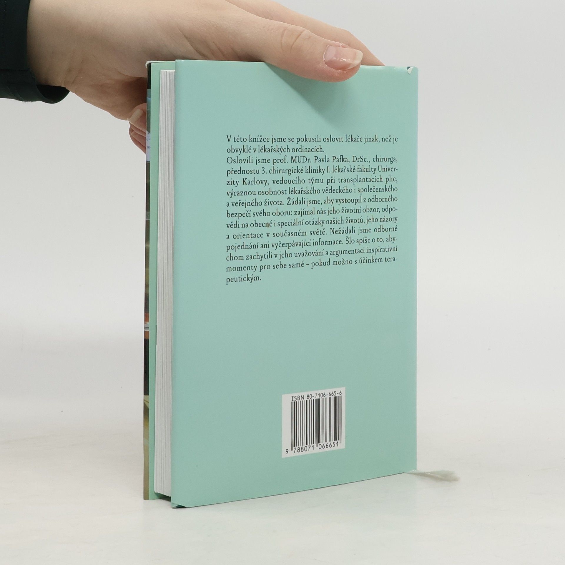 Soubor úvah a reflexí současné významné osobnosti z oboru chirurgie prof. MUDr. Pavla Pafka, DrSc., týkajících se obecných i speciálních otázek našeho života. Výlučná namáhavá profese předpokládající přísnou vnitřní kázeň, každodenní setkávání se s hranicí života a smrti, nelítostné oscilování mezi všemocností a bezmocností, vědomí nevratnosti vykonaných kroků a zodpovědnost za ně, programový racionální i emocionální nadhled - to jsou základní skutečnosti, provázející život chirurga a za šťastných okolností také obohacující a prohlubující jeho životní obzor. S tímto vědomím jsme se prof. Pafka ptali - na jeho pojetí života, zrození, smrti, na pojetí nemoci a nemocného, na jeho chápání přátelství a kolegiality, lékařské etiky, pedagogického úkolu a dalších závažných témat, které vyplynuly z jeho reflexe současného profesního i občanského života.