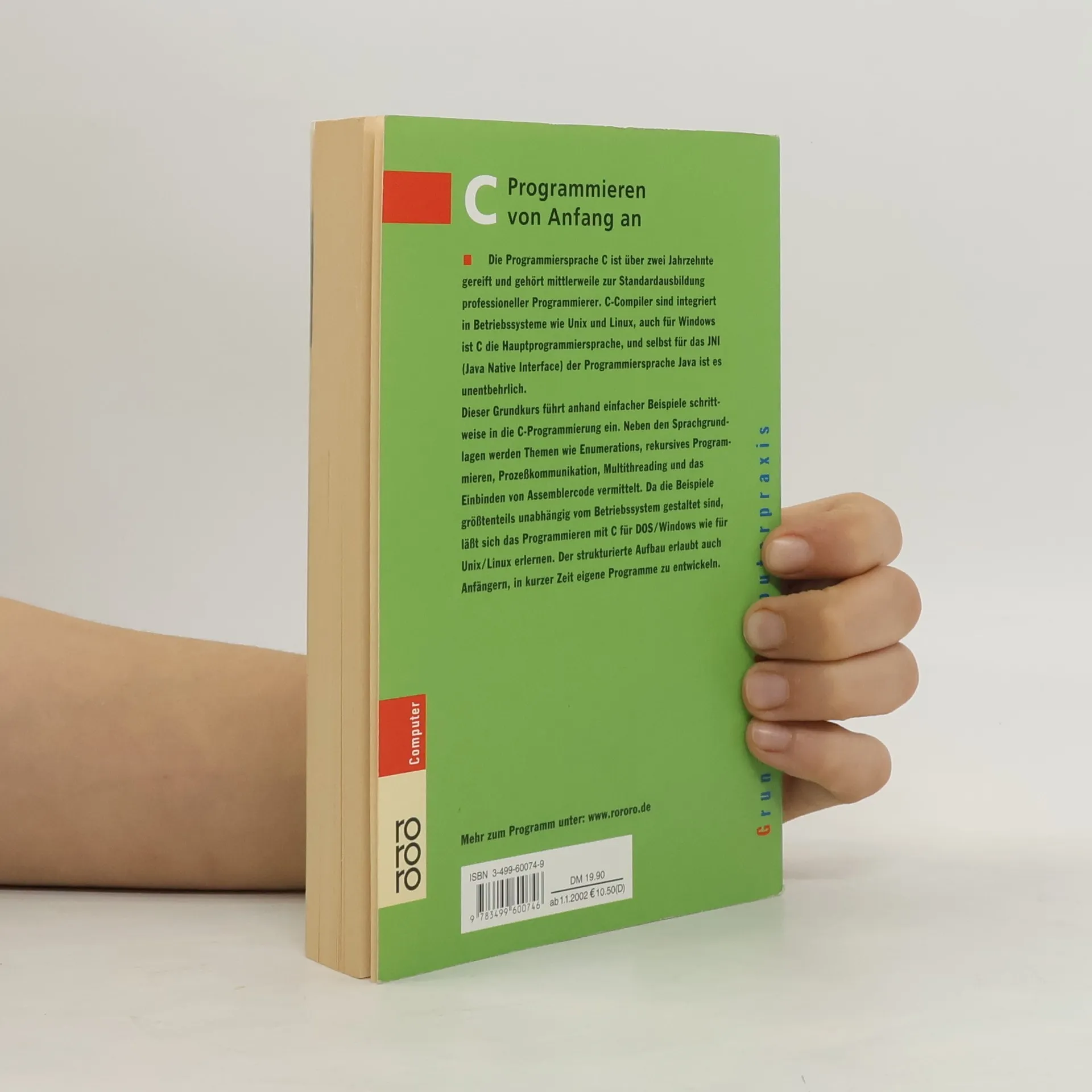 Die Programmiersprache C ist über zwei Jahrzehnte gereift und gehört mittlerweile zur Standardausbildung professioneller Programmierer. C-Compiler sind integriert in Betriebsssysteme wie Unix und Linux, auch für Windows ist C die Hauptprogrammiersprache, und selbst für das JNI (Java Native Interface) der Programmiersprache Java ist es unentbehrlich.Dieser Grundkurs führt anhand einfacher Beispiele schrittweise in die C-Programmierung ein. Neben den Sprachgrundlagen werden Themen wie Enumerations, rekursives Programmieren, Prozeßkommunikation, Multithreading und das Einbinden von Assemblercode vermittelt. Da die Beispiele größtenteils unabhängig vom Betriebssystem gestaltet sind, läßt sich das Programmieren mit C für DOS/Windows wie für Unix/Linux erlernen. Der strukturierte Aufbau erlaubt auch Anfängern, in kurzer Zeit eigene Programme zu entwickeln.