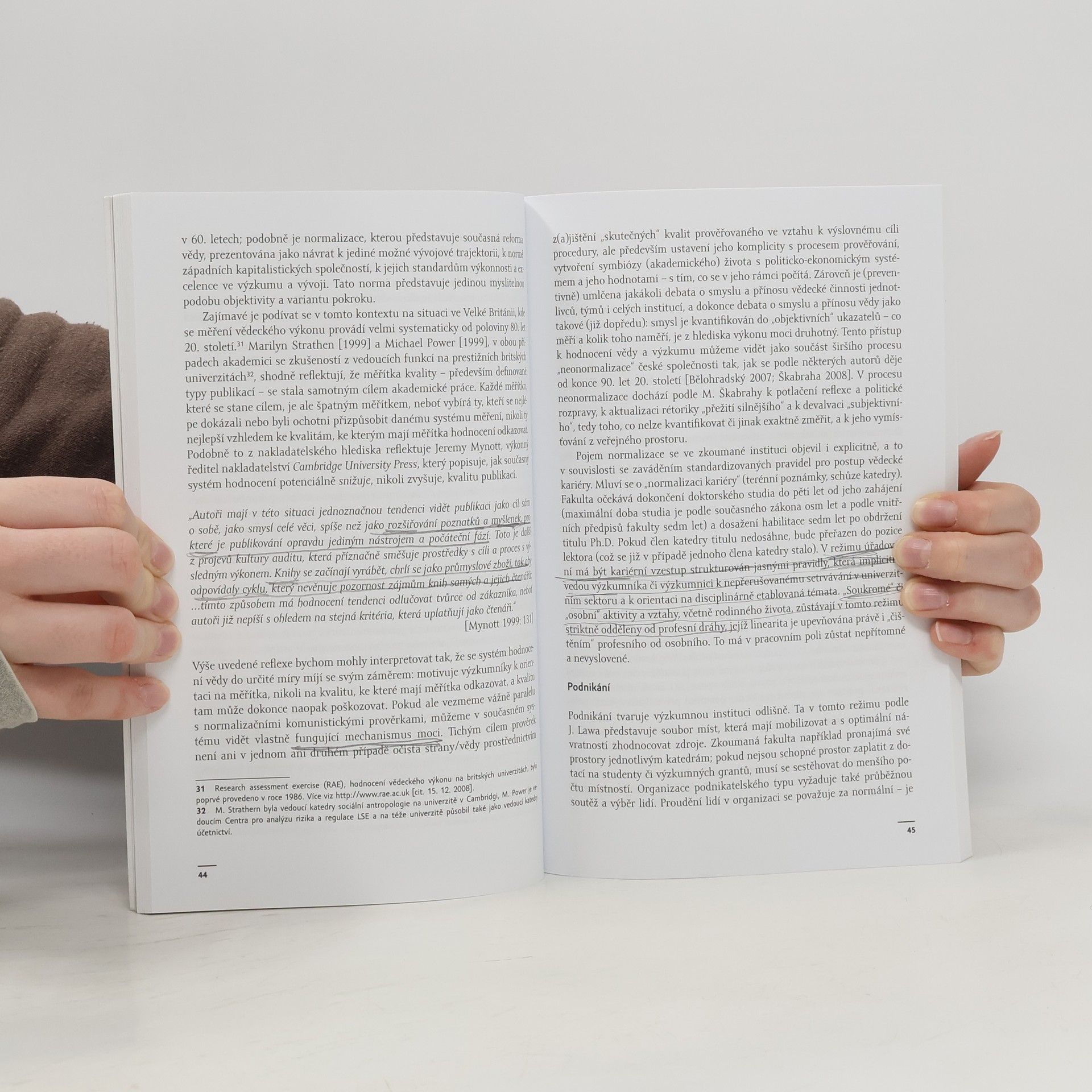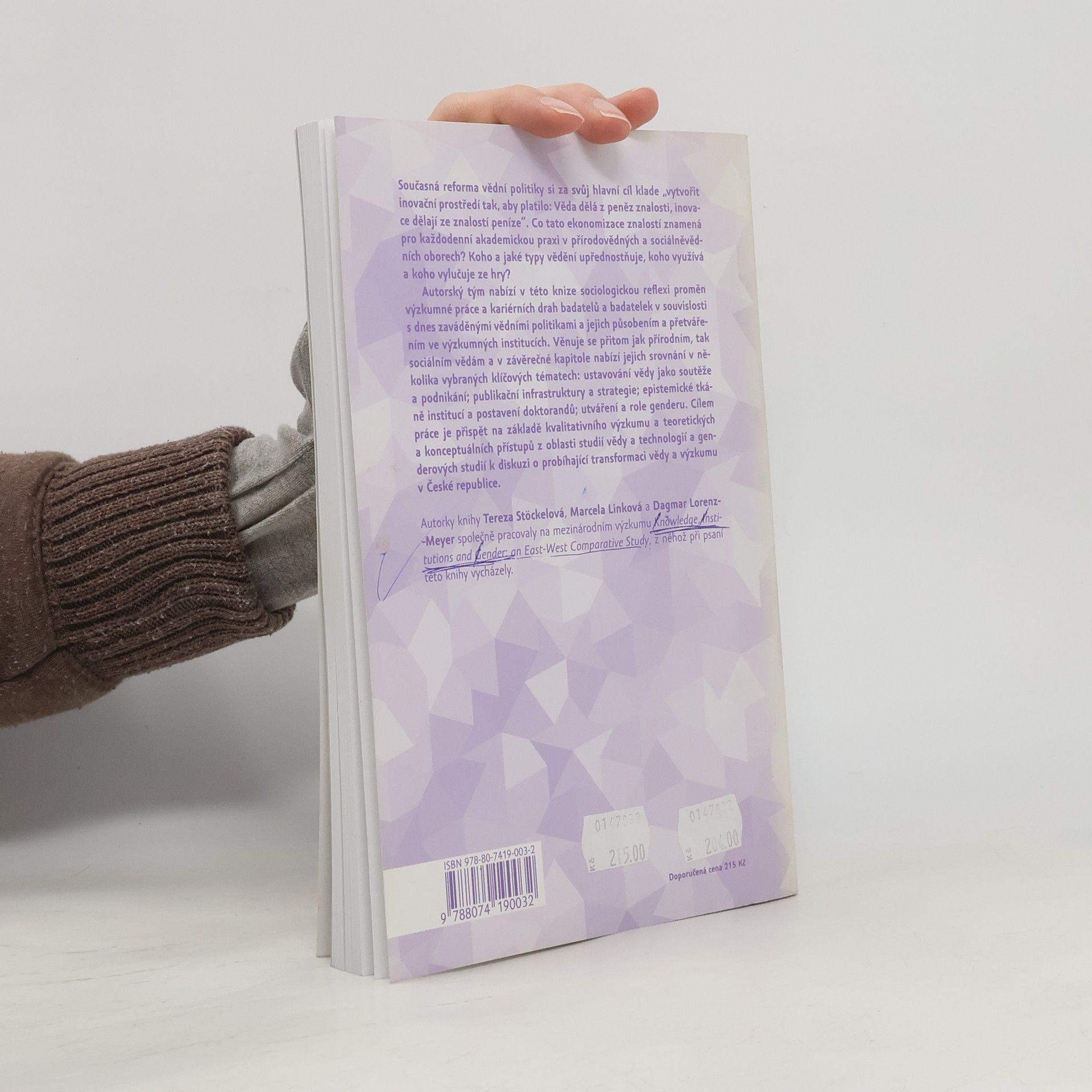 Autorský tým nabízí v této knize sociologickou reflexi proměn výzkumné práce a kariérních drah badatelů a badatelek v souvislosti s dnes zaváděnými vědními politikami a jejich působením a přetvářením ve výzkumných institucích. Věnuje se přitom jak přírodním, tak sociálním vědám a v závěrečné kapitole nabízí jejich srovnání v několika vybraných klíčových tématech: ustavování vědy jako soutěže a podnikání, publikační infrastruktury a strategie, epistemické tkáně institucí a postavení doktorandů, utváření a role genderu. Cílem práce je přispět na základě kvalitativního výzkumu a teoretických a konceptuálních přístupů z oblasti studií vědy a technologií a genderových studií k diskuzi o probíhající transformaci vědy a výzkumu v České republice.