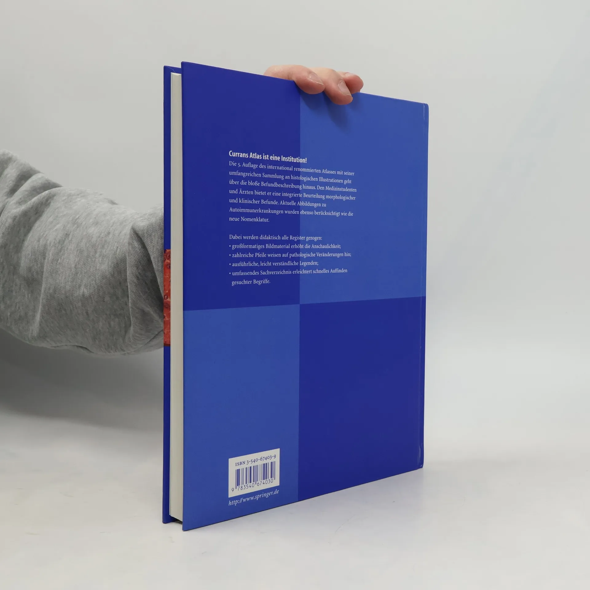 Currans Farbatlas ist eine Institution! Die 5. Auflage des international renommierten Atlasses mit seiner umfangreichen Sammlung an histologischen Illustrationen geht über die bloße Befundbeschreibung hinaus. Den Medizinstudenten und Ärzten bietet er eine integrierte Beurteilung morphologischer und klinischer Befunde. Aktuelle Abbildungen zu Autoimmunerkrankungen wurden ebenso berücksichtigt wie die neue Nomenklatur. Dabei werden didaktisch alle Register gezogen:- großformatiges Bildmaterial erhöht die Anschaulichkeit; - zahlreiche Pfeile weisen auf pathologische Veränderungen hin; - ausführliche, leicht verständliche Legenden; umfassendes Sachverzeichnis erleichtert schnelles Auffinden gesuchter Begriffe. TOC:Allgemeine Pathologie; Blut, Milz, Lymphknoten, Knochenmark; Ohr, Nase, Mundhöhle; Verdauungstrakt; Leber, Gallenblase, Pankreas; Herz, Arterien; Trachea, Bronchien, Lunge; Endokrine Organe; Zentralnervensystem, Auge; Nieren, Harnblase; Männliche Geschlechtsorgane; Weibliche Geschlechtsorgane, Mamma; Knochen, Knorpel, Gelenke; Haut.