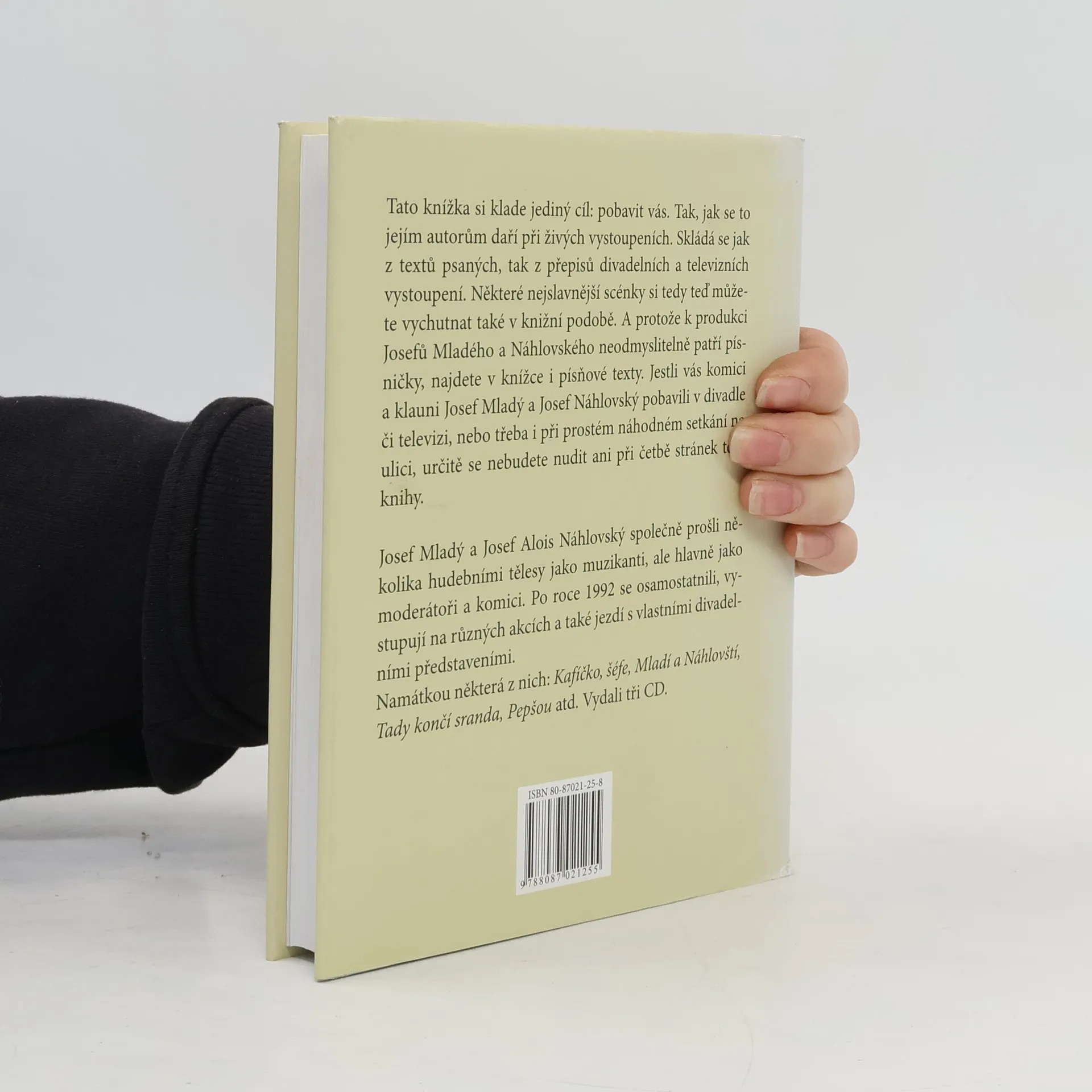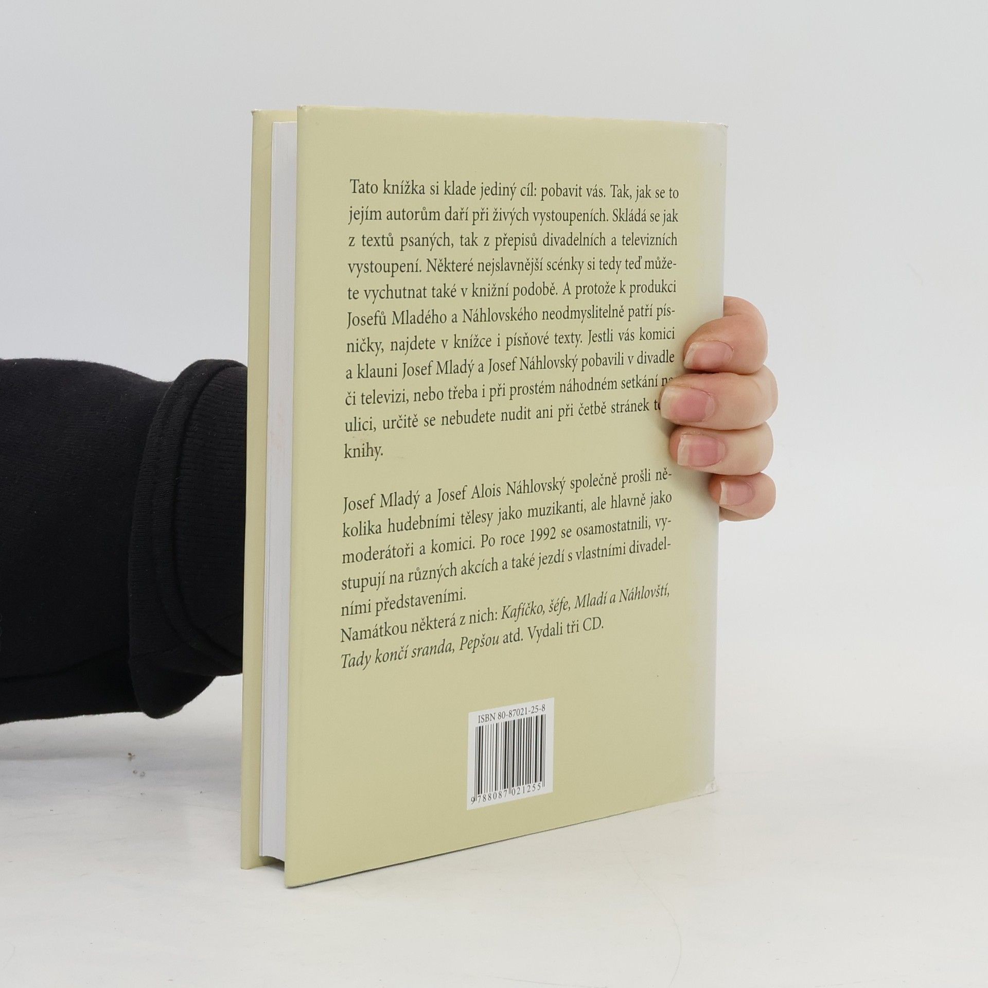 Tato knížka si klade jediný cíl: pobavit vás. Tak, jak se to jejím autorům daří při živých vystoupeních. Skládá se jak z textů psaných, tak z přepisů divadelních a televizních vystoupení. Některé nejslavnější scénky si tedy teď můžete vychutnat také v knižní podobě. A protože k produkci Josefů Mladého a Náhlovského nedomyslitelně patří písničky, najdete v knížce i písňové texty. Jestli vás komici a klauni Josef Mladý a Josef Náhlovský pobavili v divadle či televizi, nebo třeba i při prostém náhodném setkání na ulici, určitě se nebudete nudit ani při četbě stránek této knihy. Josef Mladý a Josef Alois Náhlovský společně prošli několika hudebními tělesy jako muzikanti, ale hlavně jako moderátoři a komici. Po roce 1992 se osamostatnili, vystupují na různých akcích a také jezdí s vlastními divadelními představeními. Namátkou některá z nich: Kafíčko, šéfe; Mladí a Náhlovští; Tady končí sranda; Pepšou atd.