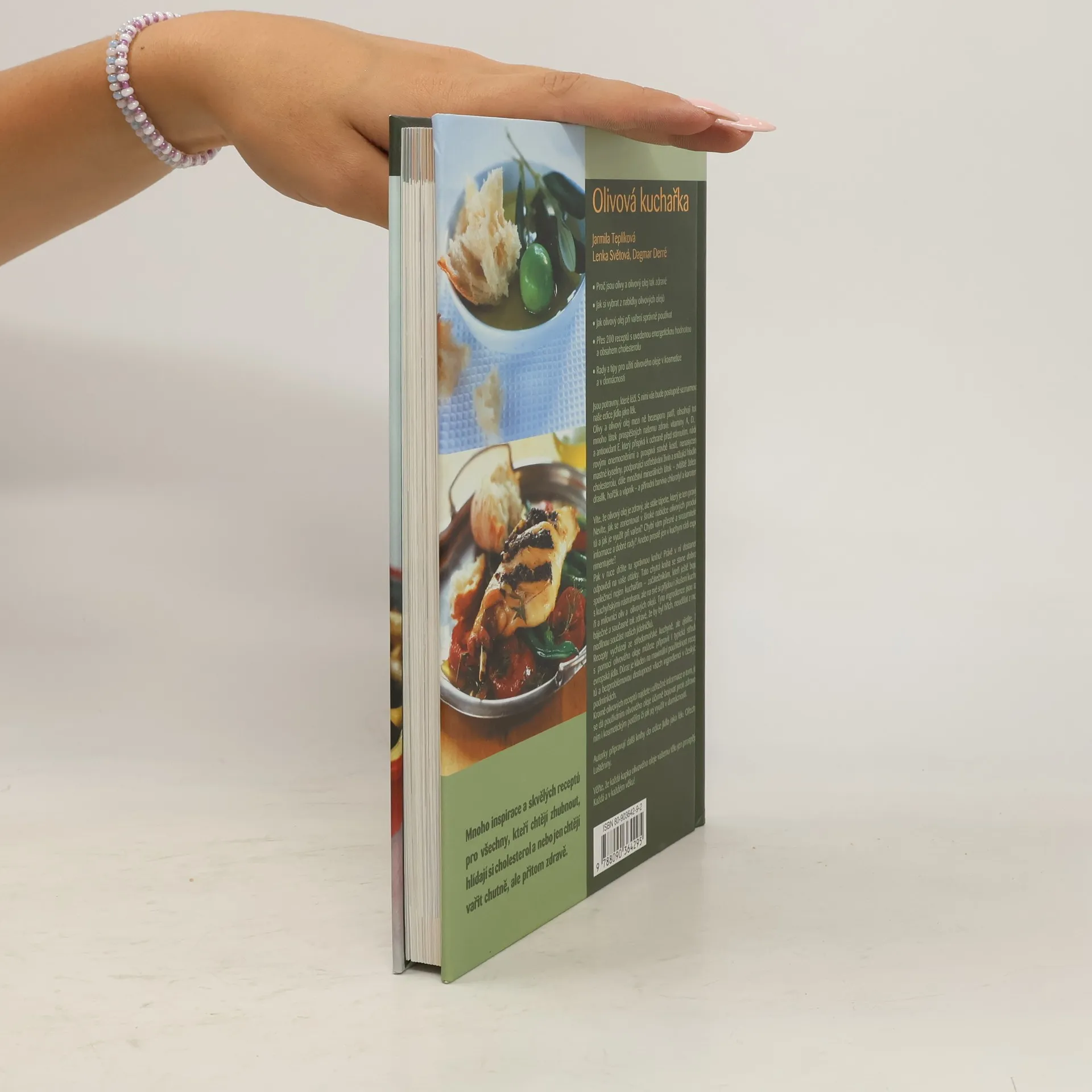 Olivová kuchařka seznamuje čtenáře s potravinami, které mají pozitivní vliv na naše zdraví. Olivy a olivový olej obsahují mnoho látek prospěšných našemu zdraví: vitaminy A, D, K a antioxidant E, který přispívá k ochraně před stárnutím, nádorovými onemocněními a prospívá stavbě kostí, nenasycené mastné kyseliny, podporující vstřebávání živin a snižující hladinu cholesterolu. Všichni víme, že olivy a olivový olej je zdravý, málokdo ale ví, jak jejich potenciálu co nejlépe využít. Olivy a olivové oleje nabízí nepřeberné možnosti využití nejen v kuchyni, ale i v kosmetice. V knize Olivová kuchařka najdete mnoho receptů, praktických informací, a především rady a tipy. Autorky Jarmila Teplíková, Lenka Světová, Dagmar Derré vám poradí jak si vybrat olivový olej, jak s ním vařit, smažit, péct. Recepty vycházejí ze středomořské kuchyně, ale zjistíte, že s pomocí olivového oleje můžete připravit i typická středoevropská jídla. Důraz je kladen na maximální použitelnost receptů a dostupnost ingrediencí v českých podmínkách. Recepty mají spočítánu energetickou hodnotu a obsah cholesterolu. Zajímavá je také kapitola o tom, jak s pomocí olivového oleje účinně bojovat proti zdravotním potížím a jak jej využít v kosmetice a domácnosti. Jak používat olivový olej, výrobky z oliv nejen v kuchyni, ale i v kosmetice, a především rady a tipy, jak potencionálu oliv co nejefektivněji využít. ... celý text