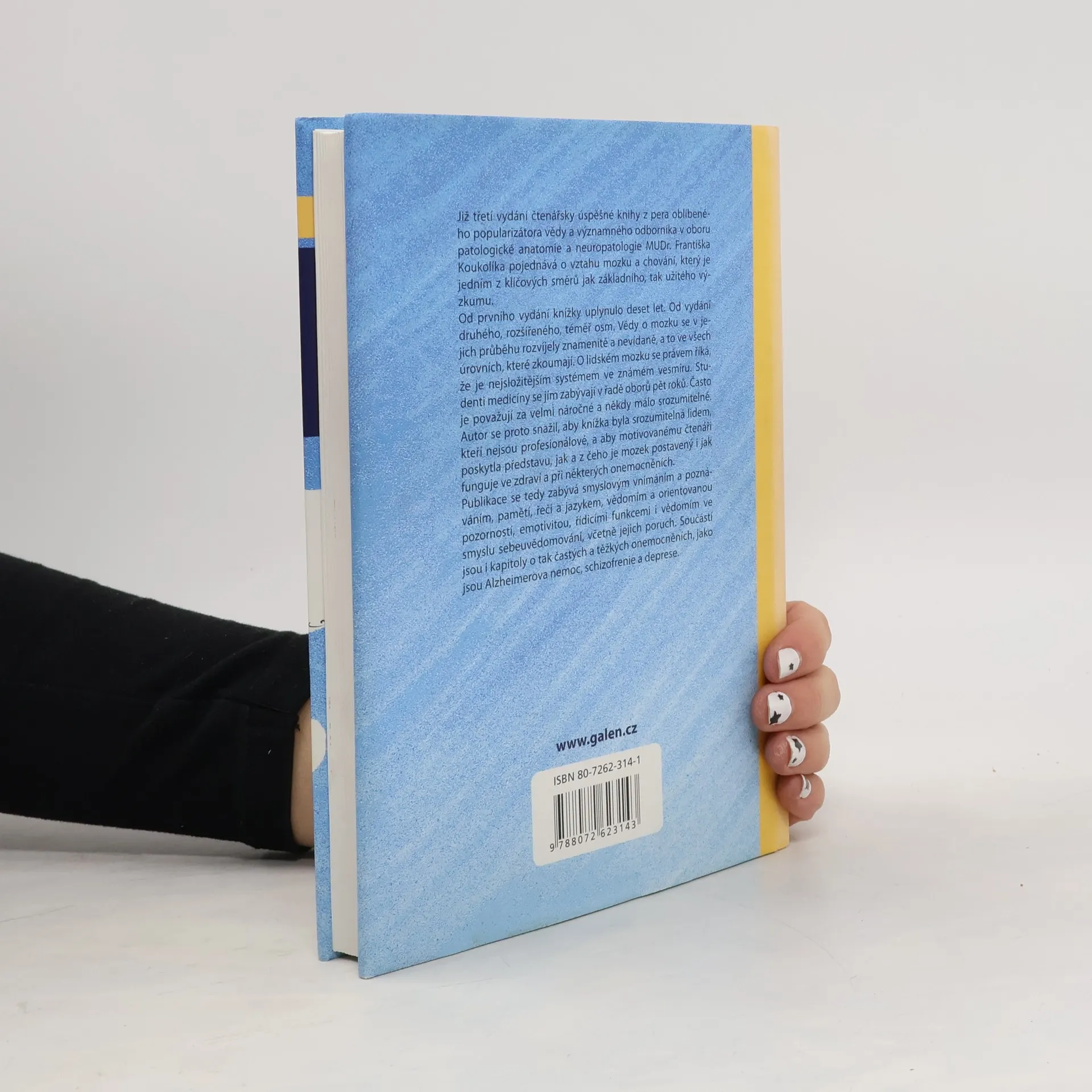 Již třetí vydání čtenářsky úspěšné knihy z pera oblíbeného popularizátora vědy a významného odborníka v oboru patologické anatomie a neuropatologie MUDr. Františka Koukolíka pojednává o vztahu mozku a chování, který je jedním z klíčových směrů jak základního, tak užitého výzkumu. Publikace se zabývá smyslovým vnímáním a poznáváním, pamětí, řečí a jazykem, vědomím a orientovanou pozorností, emotivitou, řídicími funkcemi i vědomím ve smyslu sebeuvědomování, včetně jejich poruch. Součástí jsou i kapitoly o tak častých a těžkých onemocněních, jako jsou Alzheimerova nemoc, schizofrenie a deprese.
