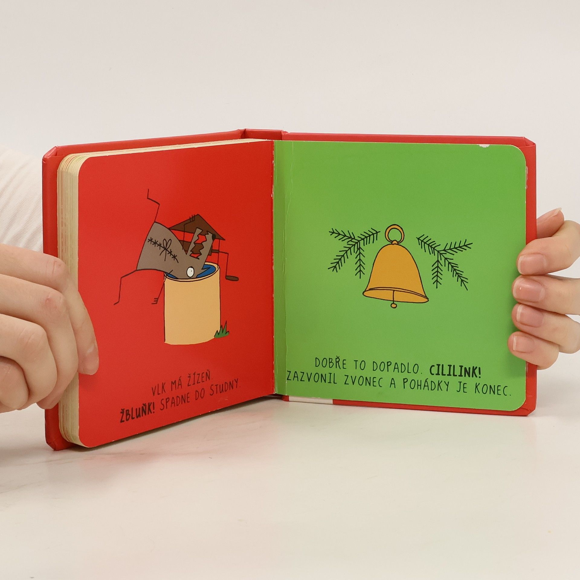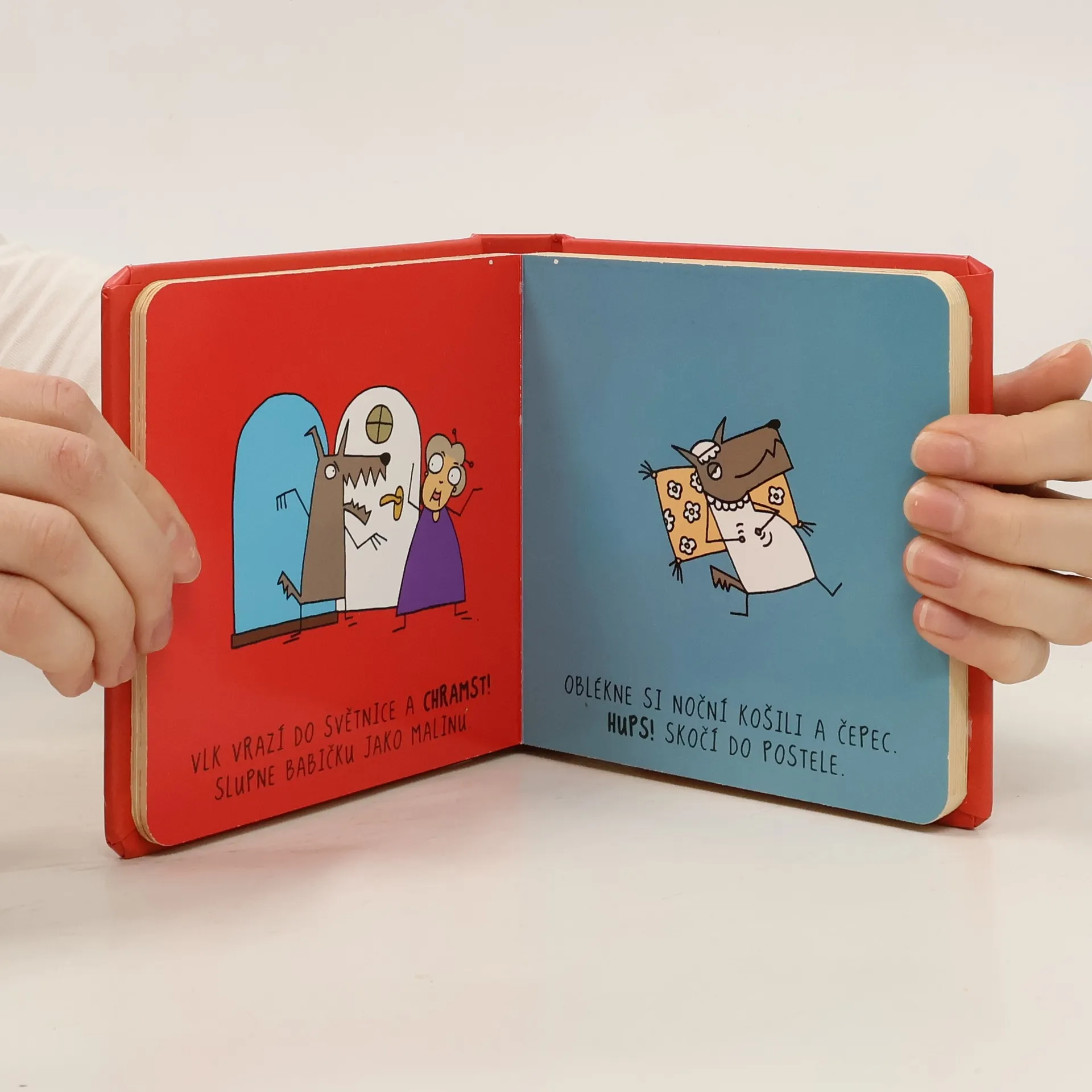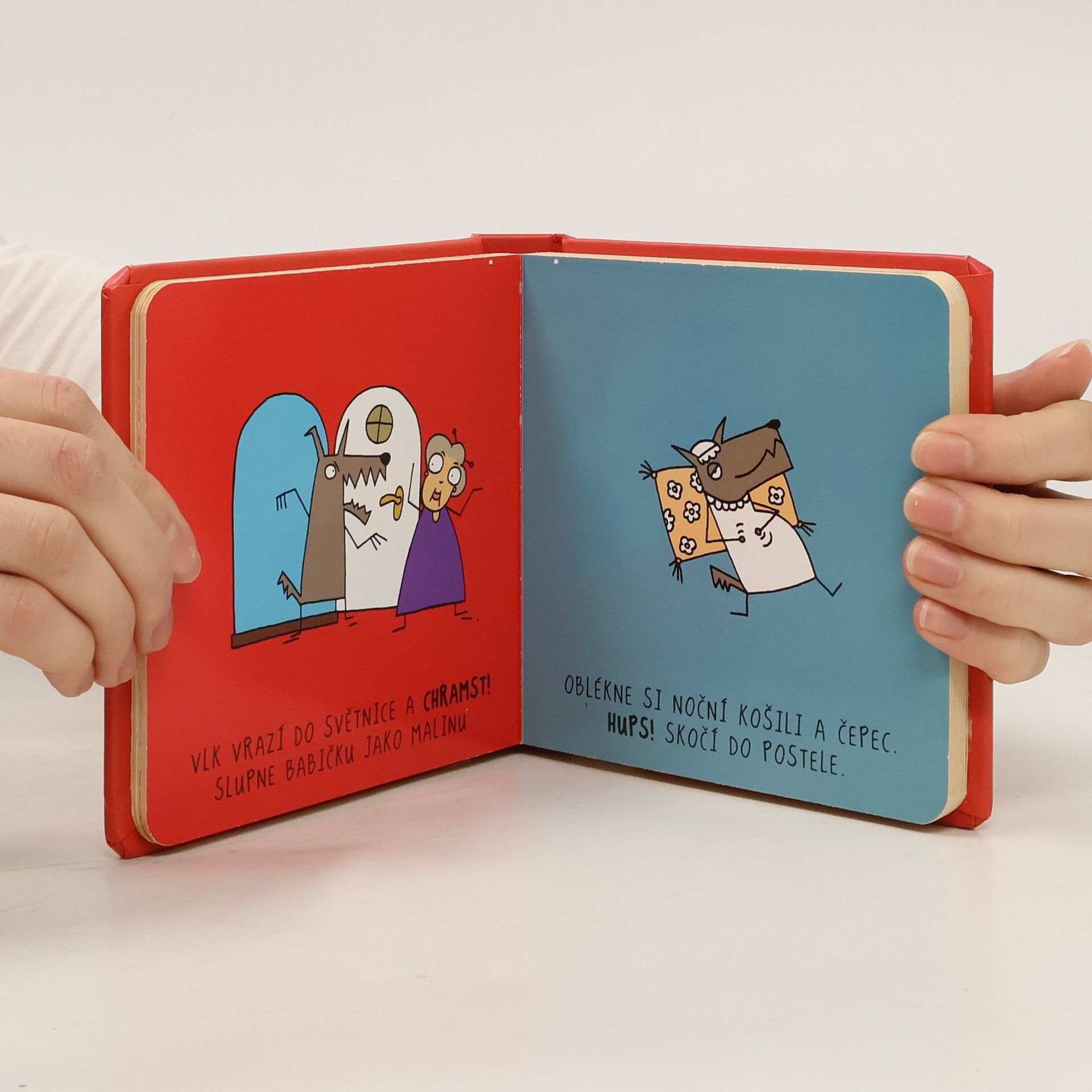 Jednoduchý a všem známý příběh o Červené karkulce je zde ozvláštněn všemožnými výkřiky, které vystihují např. pocity pohádkových postaviček nebo zvuky okolí. Karkulka nese babičce košík dobrot (mňam!), avšak vlk ji předběhne a babičku i s Karkulkou sežere (chramst), naštěstí jde kolem myslivec (dup dup) a babičku s Karkulkou vysvobodí (sláva!). Texty jsou psány velkým písmem a jsou doprovázeny výraznými vtipnými ilustracemi