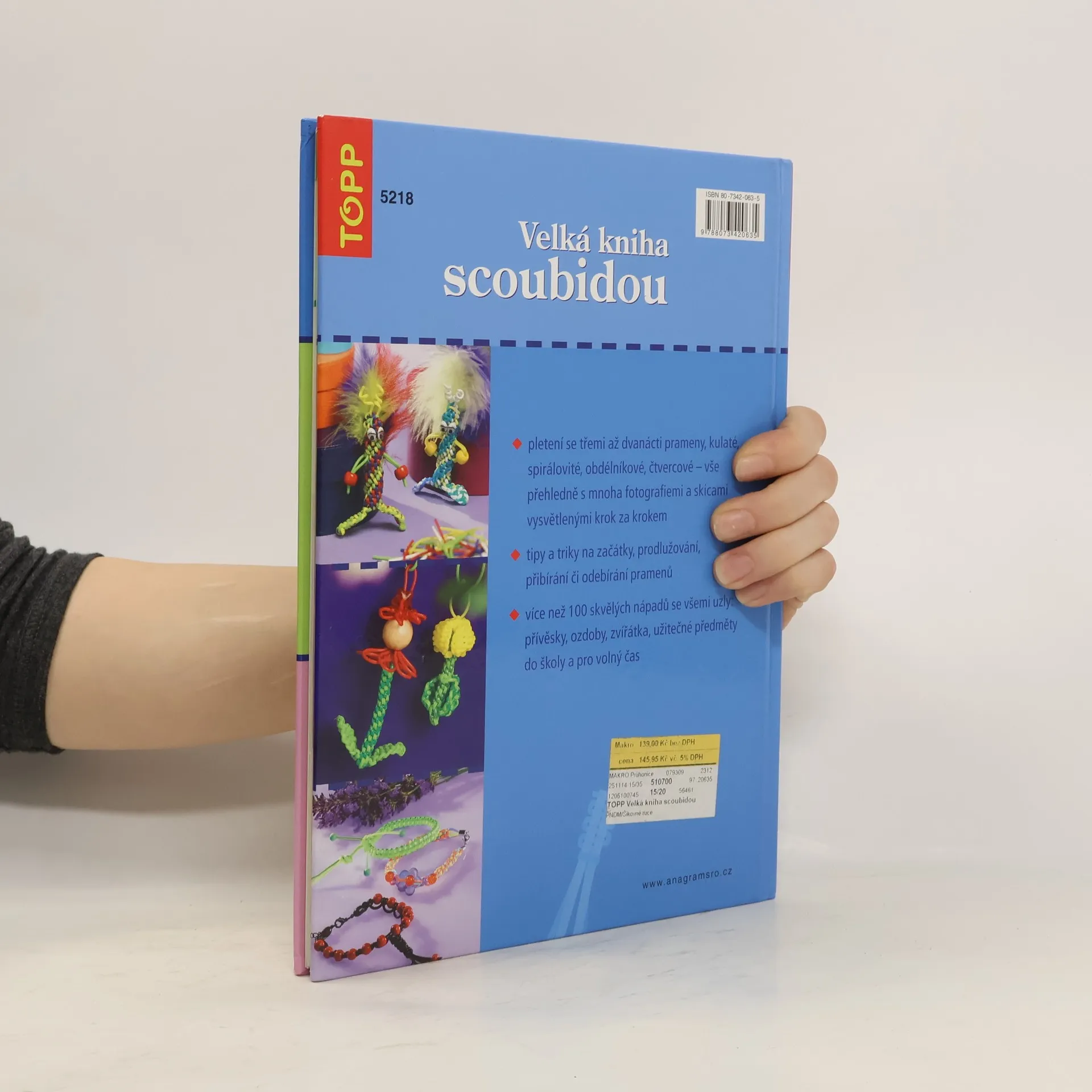 Podtitul: všechny uzly, tipy a triky : [s bužírkou i jinými materiály Ze scoubi - barevných bužírek - upletete nádherné věci. Náramky, přívěsky na klíče, barevná zvířátka či pestré propisky - vaší tvořivosti se meze nekladou. V této knize najdete více než 100 skvělých nápadů vytvořených ze tří až dvanácti pramenů scoubi - kulaté, spirálovité či obdélníkové scoubidou. Díky přesným popisům, barevným ilustracím a podrobně popsaným a rozkresleným postupům se vám jistě podaří vytvořit si malá umělecká dílka pro sebe i své kamarády.