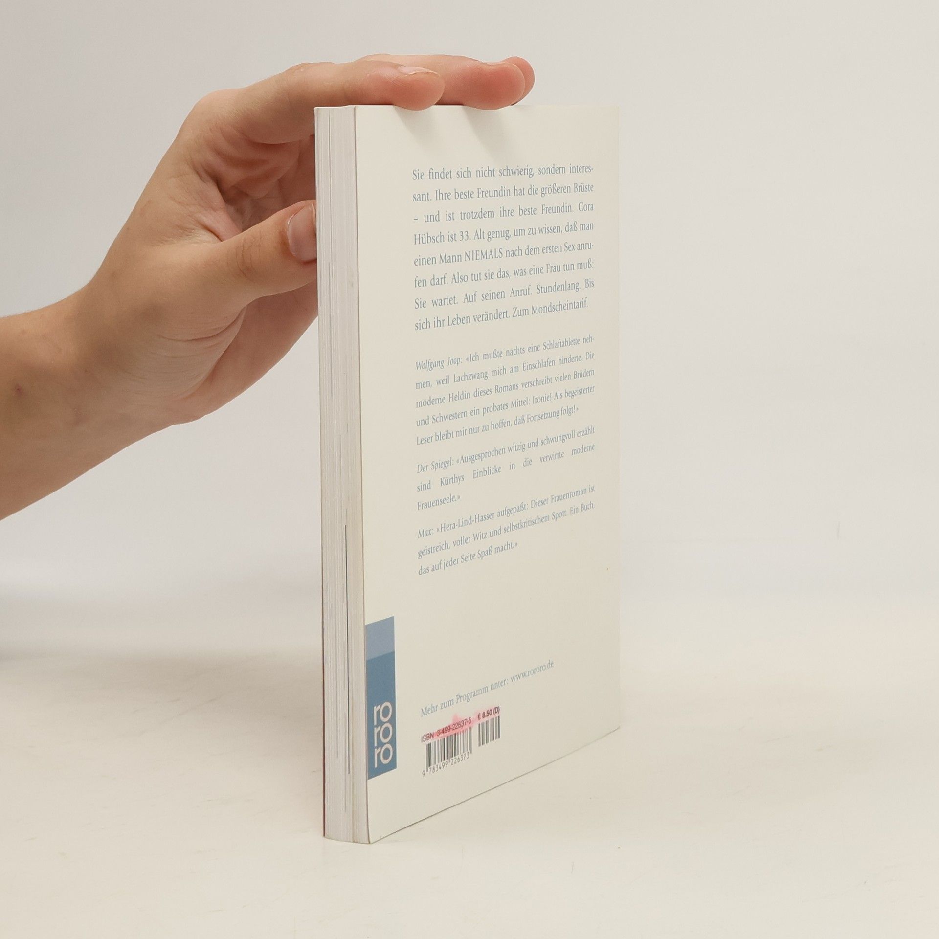 Sie findet sich nicht schwierig, sondern interessant. Ihre beste Freundin hat die größeren Brüste – und ist trotzdem ihre beste Freundin. Cora Hübsch ist 33. Alt genug, um zu wissen, dass man einen Mann niemals nach dem ersten Sex anrufen darf. Also tut sie das, was eine Frau tun muß: Sie wartet. Auf seinen Anruf. Stundenlang. Bis sich ihr Leben verändert. Zum Mondscheintarif.Wolfgang Joop: «Ich musste nachts eine Schlaftablette nehmen, weil Lachzwang mich am Einschlafen hinderte. Die moderne Heldin dieses Romans verschreibt vielen Brüdern und Schwestern ein probates Mittel: Ironie! Als begeisterter Leser bleibt mir nur zu hoffen, dass Fortsetzung folgt!»Der Spiegel: «Ausgesprochen witzig und schwungvoll erzählt sind Kürthys Einblicke in die verwirrte moderne Frauenseele.»Max: «Hera-Lind-Hasser aufgepaßt: Dieser Frauenroman ist geistreich, voller Witz und selbstkritischem Spott. Ein Buch, das auf jeder Seite Spaß macht.»