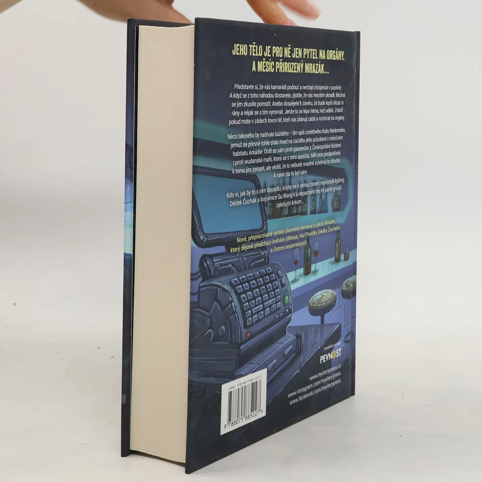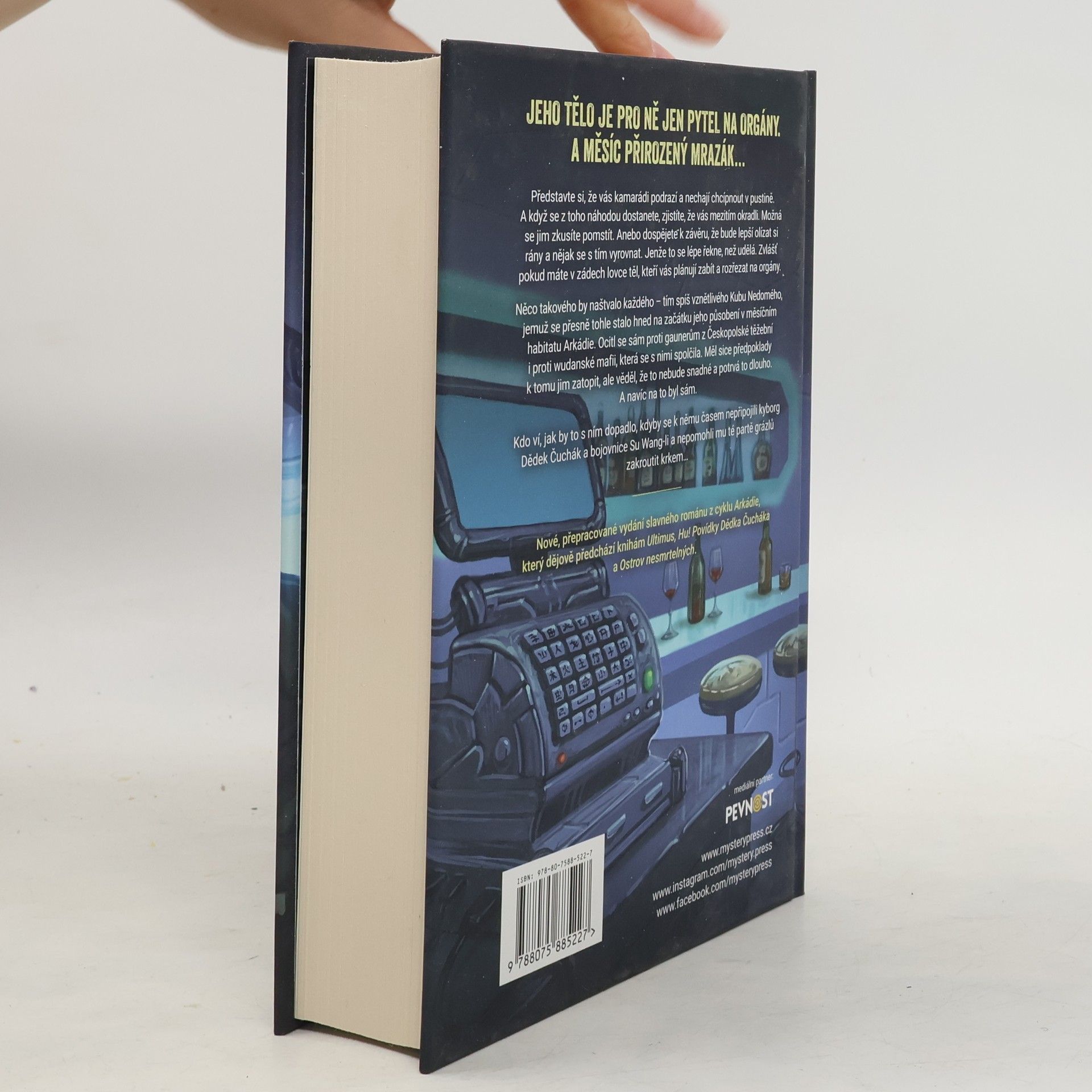 JEHO TĚLO JE PRO NĚ JEN PYTEL NA ORGÁNY. A MĚSÍC PŘIROZENÝ MRAZÁK…Představte si, že vás kamarádi podrazí a nechají chcípnout v pustině. A když se z toho náhodou dostanete, zjistíte, že vás mezitím okradli. Možná se jim zkusíte pomstít. Anebo dospějete k závěru, že bude lepší olízat si rány a nějak se s tím vyrovnat. Jenže to se lépe řekne, než udělá. Zvlášť pokud máte v zádech lovce těl, kteří vás plánují zabít a rozřezat na orgány.Něco takového by naštvalo každého – tím spíš vznětlivého Kubu Nedomého, jemuž se přesně tohle stalo hned na začátku jeho působení v měsíčním habitatu Arkádie. Ocitl se sám proti gaunerům z Českopolské těžební i proti wudanské mafii, která se s nimi spolčila. Měl sice předpoklady k tomu jim zatopit, ale věděl, že to nebude snadné a potrvá to dlouho. A navíc na to byl sám.Kdo ví, jak by to s ním dopadlo, kdyby se k němu časem nepřipojili kyborg Dědek Čuchák a bojovnice Su Wang-li a nepomohli mu té partě grázlů zakroutit krkem…___Nové, přepracované vydání slavného románu z cyklu Arkádie, který dějově předchází knihám Ultimus, Hu! Povídky Dědka Čucháka a Ostrov nesmrtelných.