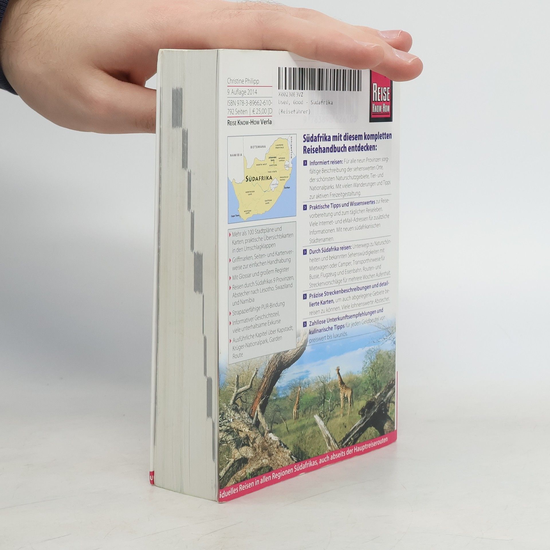 Südafrika mit diesem umfassenden Reiseführer von Reise Know-How entdecken: - Informationen, Routenbeschreibungen und praktische Tipps für eine schöne, gelungene Reise durch alle 9 Provinzen des Landes - Konzipiert für Aktivreisende, die Südafrika auf eigene Faust kennenlernen wollen - Ausführliche Beschreibung der Nationalparks und Naturschutzgebiete, Vorschläge für Wanderungen - Detaillierte Ortsbeschreibungen mit Sehenswürdigkeiten sowie Ausflügen ins Umland - Unterkünfte von luxuriös bis preiswert: Hotels, Backpackers, Bed & Breakfasts, Camping - Gastronomie-Tipps, ausgewählte Restaurants, Versorgung unterwegs - Aktuell recherchierte Adressen und Preise - Ausführliche Kapitel zu Kapstadt, Krügerpark und Garden Route - Tipps für Abstecher nach Swaziland, Lesotho und ins südliche Namibia - Wissenswertes zur Geschichte Südafrikas, zu Land, Leuten und Kultur - Südafrika preiswert: Tipps für Schüler, Studenten und Backpacker - Mit den neuen südafrikanischen Städte- und Provinznamen. +++++ Ausstattung: 768 Seiten, zahlreiche Abbildungen und Fotos, über 100 detaillierte Stadtpläne und Karten, farbige Übersichtskarten im Umschlag, Glossar, ausführliches Register, strapazierfähige PUR-Bindung.