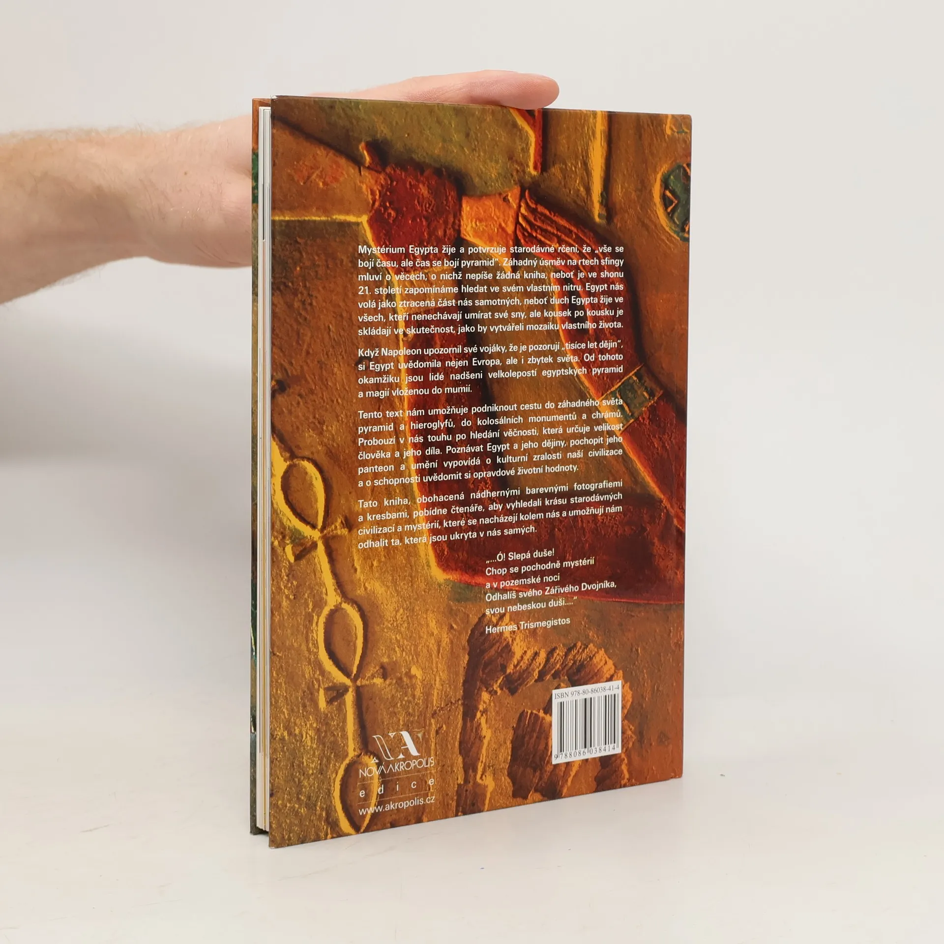 Mystérium Egypta žije a potvrzuje starodávné rčení, že ´vše se bojí času, ale čas se bojí pyramid´. Záhadný úsměv na rtech sfingy mluví o věcech, o nichž nepíše žádná kniha, neboť je ve shonu 21. století zapomínáme hledat ve svém vlastním nitru. Egypt nás volá, jako ztracená část nás samotných, neboť duch Egypta žije ve všech, kteří nenechávají umírat své sny, ale kousek po kousku je skládají ve skutečnost, jako by vytvářeli mozaiku vlastního života. Když Napoleon upozornil své vojáky, že je pozorují ´tisíce let dějin´, si Egypt uvědomila nejen Evropa, ale i zbytek světa. Od tohoto okamžiku jsou lidé nadšeni velkolepostí egyptských pyramid a magií vloženou do mumií. Tento text nám umožňuje podniknout cestu do záhadného světa pyramid a hieroglyfů, do kolosálních památek a chrámů. Probouzí v nás touhu po hledání věčnosti, která určuje velikost člověka a jeho díla. Poznávat Egypt a jeho dějiny, pochopit jeho panteon a umění vypovídá o kulturní zralosti naší civilizace a o schopnosti uvědomit si opravdové životní hodnoty. Tato kniha, obohacená nádhernými barevnými fotografiemi a kresbami, pobídne čtenáře, aby vyhledali krásu starodávných civilizací a mystérií, které se nacházejí kolem nás a umožňují nám odhalit ta, která jsou ukryta v nás samých.