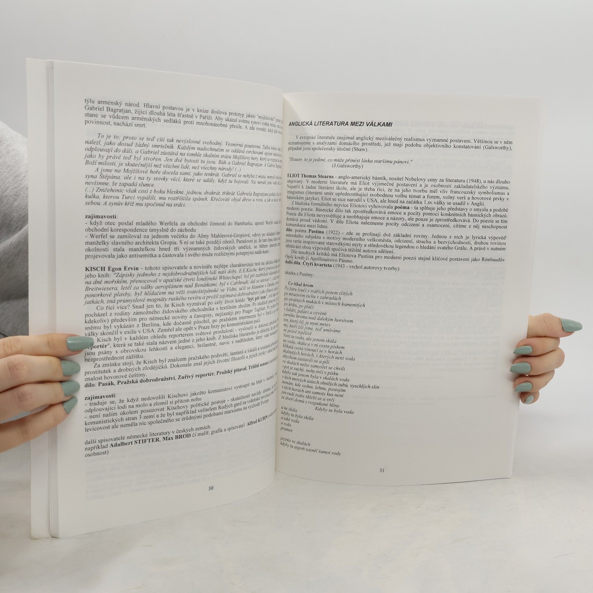 Moderní umělecké směry (kubismus, futurismus, expresionismus, dadaismus, surrealismus), počátky moderní prózy 20. století. Existencialismus, neorealismus, beatnici, nový román, absurdní literatura, magický realismus, postmodernismus atd. Významní představitelé světového dramatu 20. století, mnoho ukázek s doprovodným komentářem. Slovník výslovnosti cizích jmen, přehled laureátů Nobelovy ceny za literaturu.