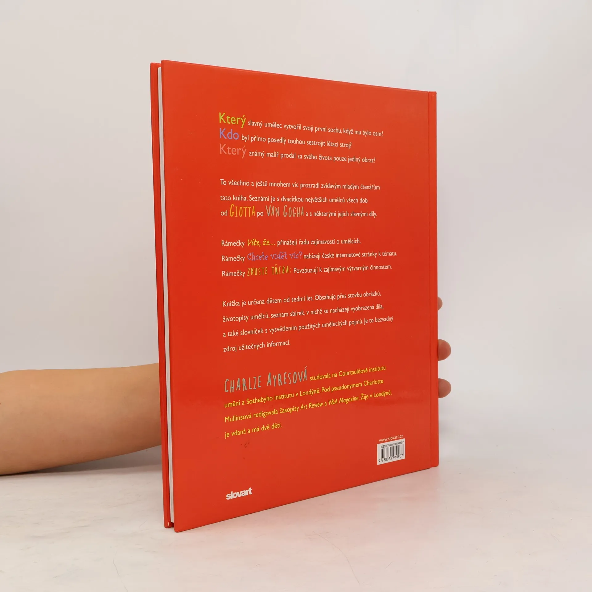 Knížka je určena dětem od sedmi let. Obsahuje přes stovku obrázků, životopisy umělců, seznam sbírek, v nichž se nacházejí vyobrazená díla, a také slovníček s vysvětlením použitých uměleckých pojmů. Je to bezvadný zdroj užitečných informací. Giotto Leonardo da Vinci Albrecht Dürer Michelangelo Raffael Tizian Hans Holbein mladší El Greco Caravaggio Artemisia Gentileschiová Gian Lorenzo Bernini Diego Velázquez Rembrandt Francisco de Goya Jacques-Luis David J. M. W. Turner Eugene Delacroix Édouard Manet Claude Monet Vincent Van Gogh Kniha Životy velkých umělců vás zavede do míst, kde umělecká díla vznikla a seznámí vás s tím, proč a pro koho je umělci tvořili a zda s nimi byli spokojeni. Tato kniha vás seznámí s životy dvaceti předních evropských umělců. Začíná v třináctém století, kdy žil italský malíř GIOTTO, který maloval lidi a místa, jak nejrealističtěji dovedl, a končí v devatenáctém století u CLAUDE MONETA a VINCENTA VAN GOGHA, kteří malovali pod širým nebem, a proto museli pracovat rychle a jakoby náznakem. Ukazuje rozdíly a společné rysy vlastní umělcům, o nichž pojednává.